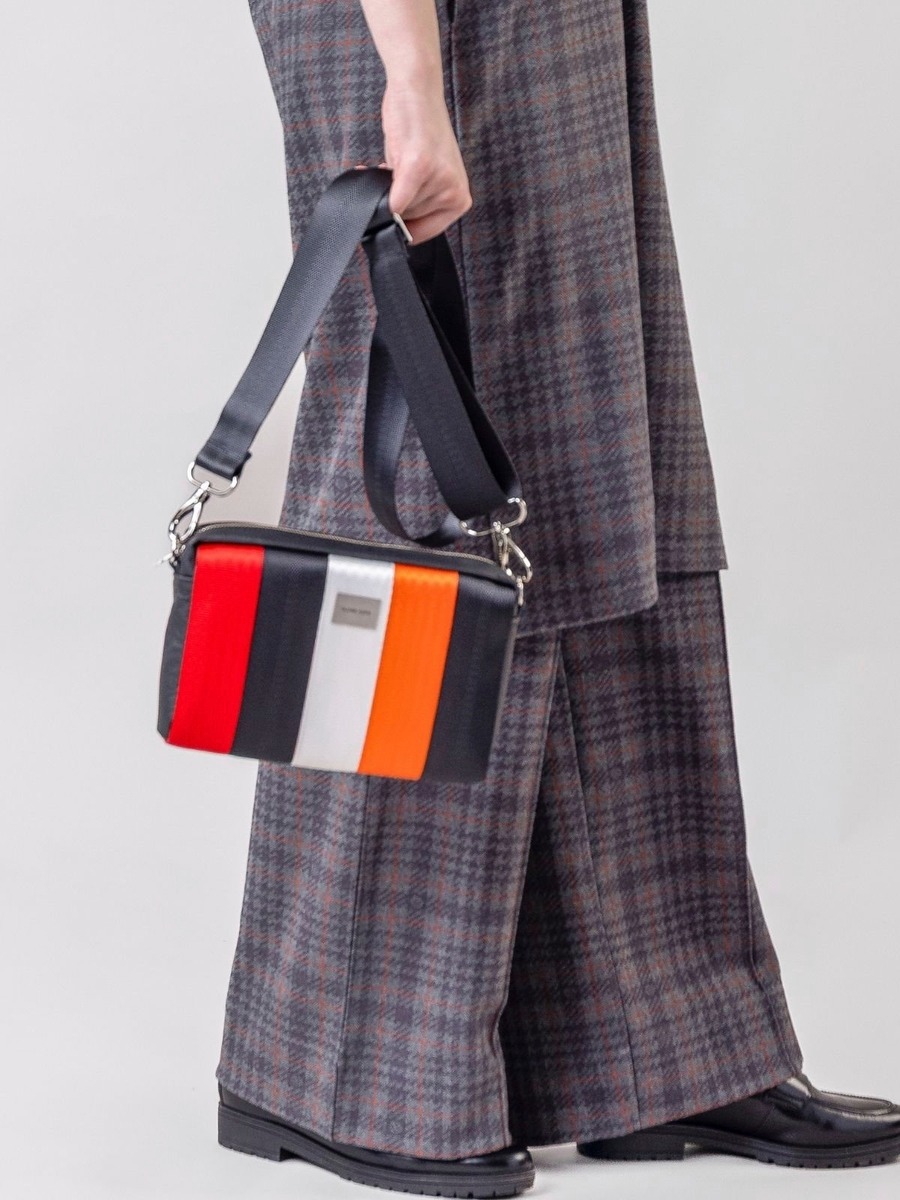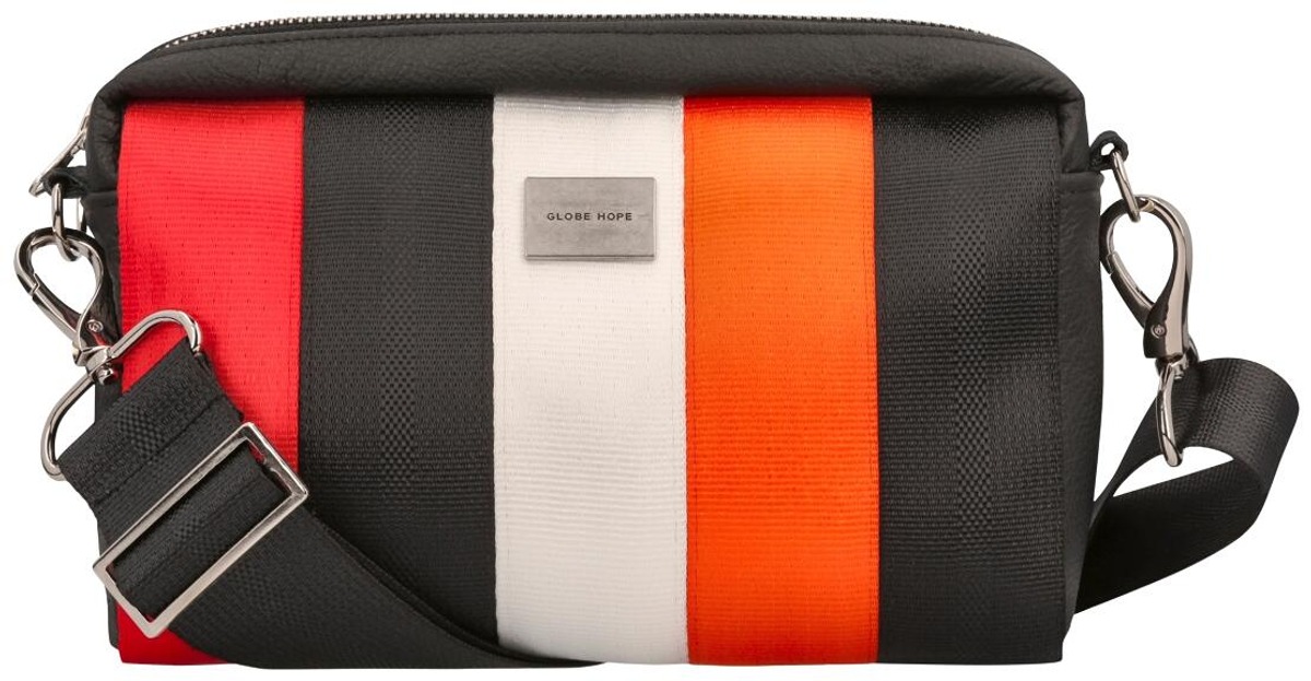 Kestävä ja uniikki: Valmistettu turvavöistä ja ylijäämänahasta, jotka tekevät jokaisesta laukusta yksilöllisen.