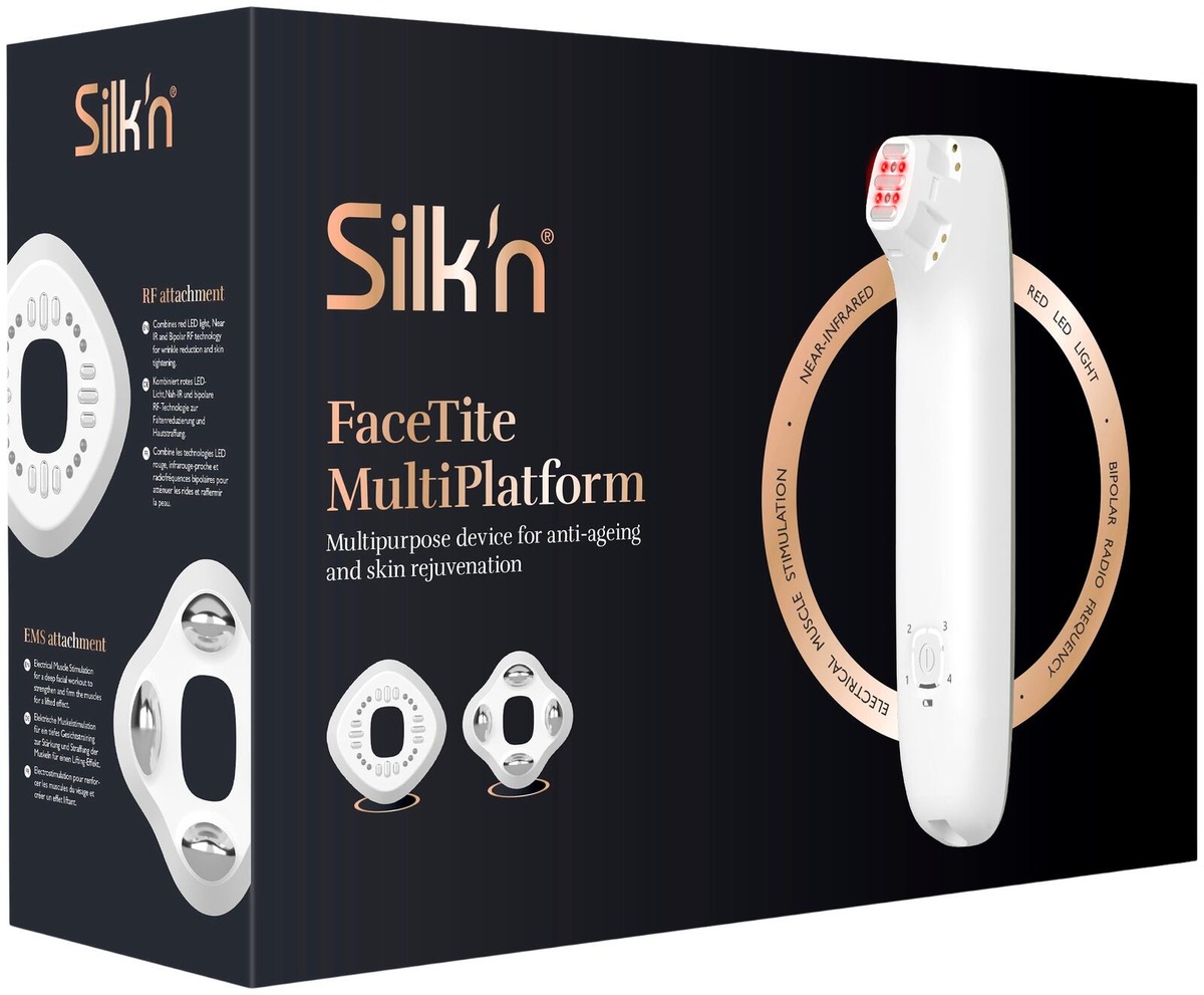 Flera tillbehör för större områden För optimala hudförbättringsresultat erbjuder Silk'n FaceTite MultiPlatform flera tillbehör, var och en med sin egen specialitet. Själva enheten har en mindre behandlingsyta för att ta itu med svåråtkomliga områden i ansiktet, som områden kring ögon och mun. Den innehåller också ett större bipolärt radiofrekvenstillbehör (RF) och ett EMS-tillbehör (elektrisk muskelstimulering). Tack vare den större ytan på tillbehören är det lättare att behandla större områden i ansiktet och på halsen på rekordtid. Välj önskad teknik genom att enkelt växla mellan tillbehören.