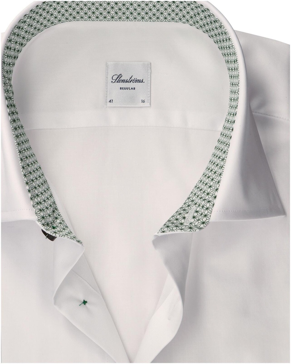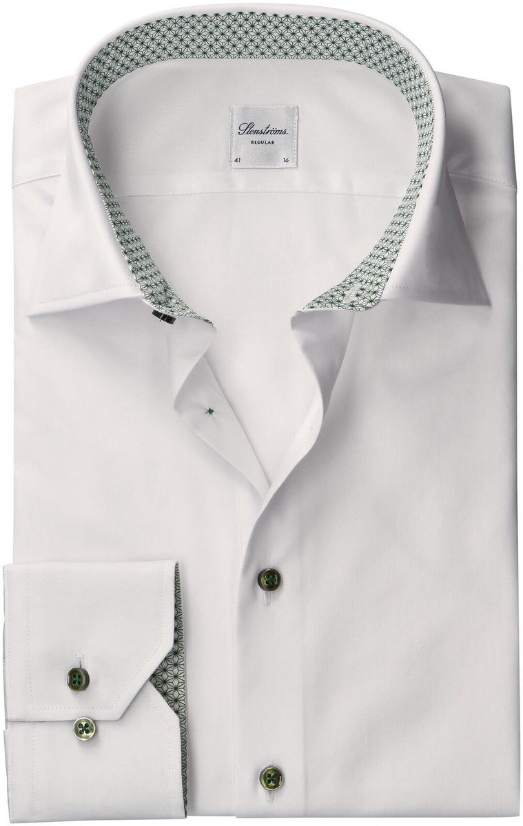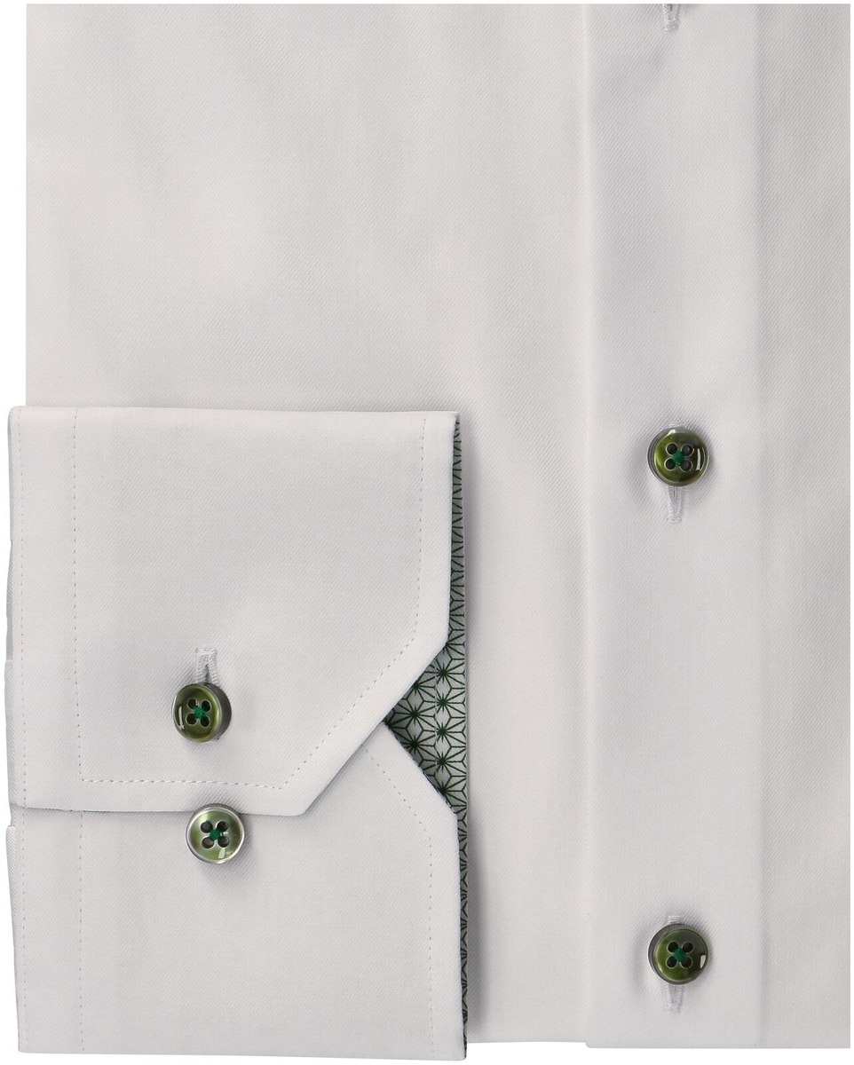 Ylellisestä Albinin Two Fold -puuvillatwillistä valmistettu valkoinen kauluspaita, jossa kontrastina vihreät helmiäisnapit ja printtikangas. Rinnan ympärys 121 cm ja vyötärön ympärys 115 cm koissa 41 ja 42.