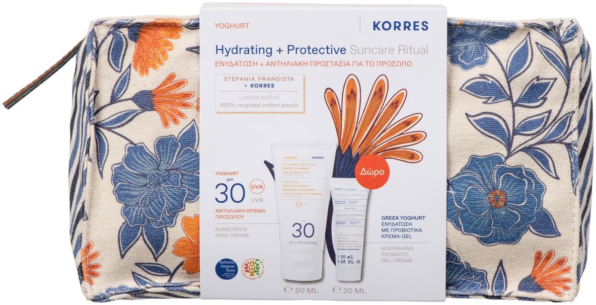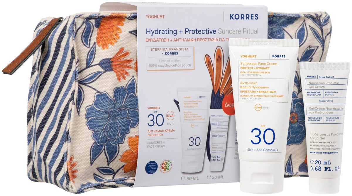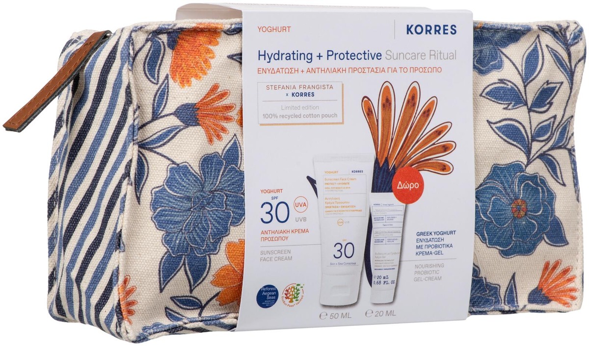 Kosteuttava ja suojaava ihonhoitopakkaus sisältää kreikkalaisella jogurtilla tehostetut ravitsevat ja hoitavat tuotteet päivittäiseen ihonhoitoon kauniissa KORRES meikkipussissa.