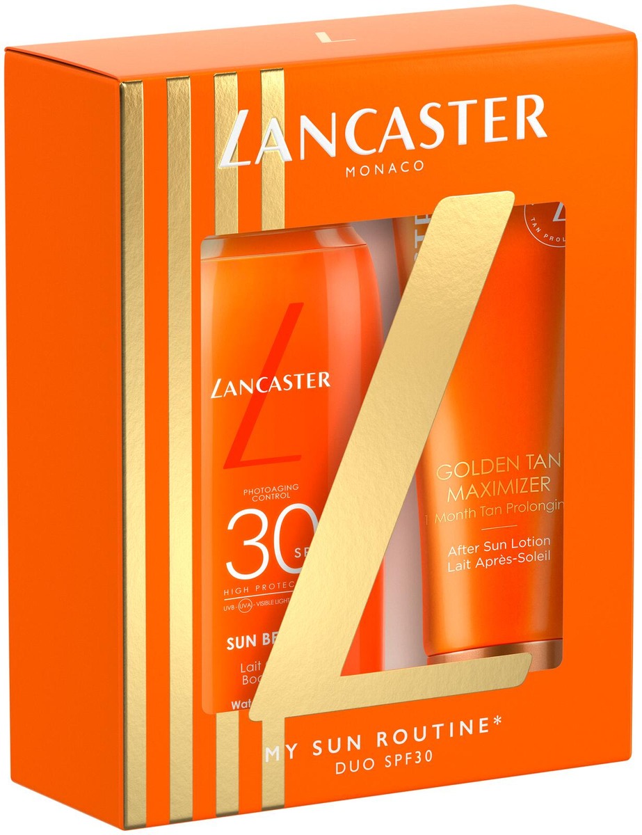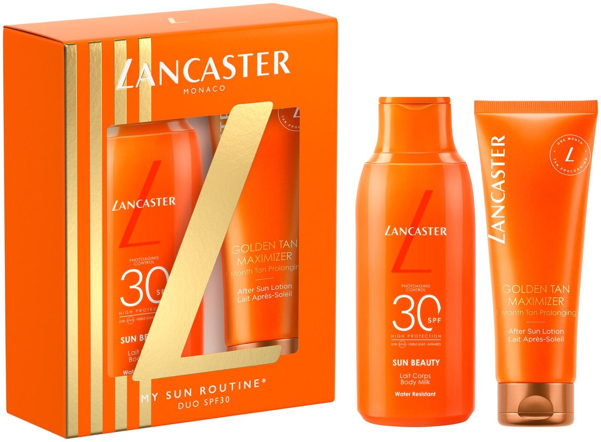 Lancasterin kesäpakkaus sisältää Sun Beauty Body Milk SPF 30 175 ml -aurinkovoiteen sekä Golden Tan Maximizer After Sun Lotion 125 ml -voiteen auringonoton jälkeen.