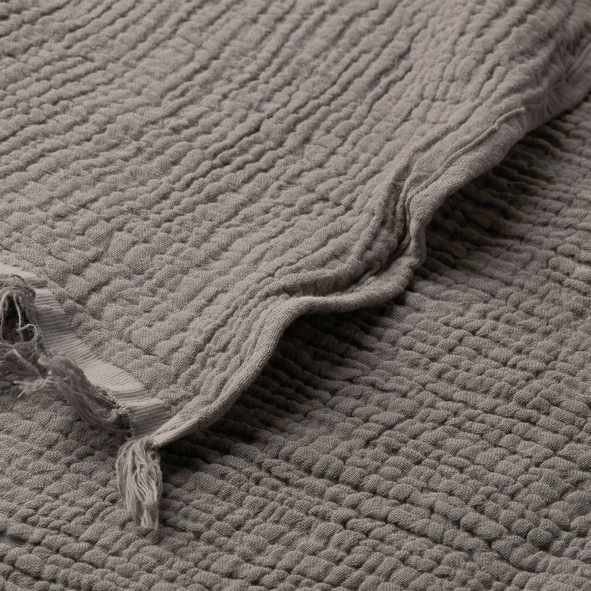 Hienosta musliinilaadusta valmistettu puuvillapäiväpeitto. Pehmeä ja mukava päiväpeitto, jossa on laineikas rakenne ja hapsut molemmissa päissä. Kankaan lankaluku 180 TC.
