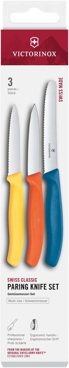 Kolmeosainen Swiss Classic -kuorimaveitsisetti helpottaa vihannesten ja hedelmien käsittelyä kuorimisesta viipalointiin - ja kaikkea siltä väliltä. Sahalaitainen veitsi puree vaivatta kovaankin kuoreen, kun taas suorateräinen veitsi on parhaimmillaan hedelmien ja vihannesten hukkapalojen poistamisessa. Setissä on seuraavat välineet: suorateräinen kuorimaveitsi terä 8 cm oranssi sahalaitainen kuorimaveitsi terä 8 cm keltainen ja tomaattiveitsi terä 11 cm sininen.