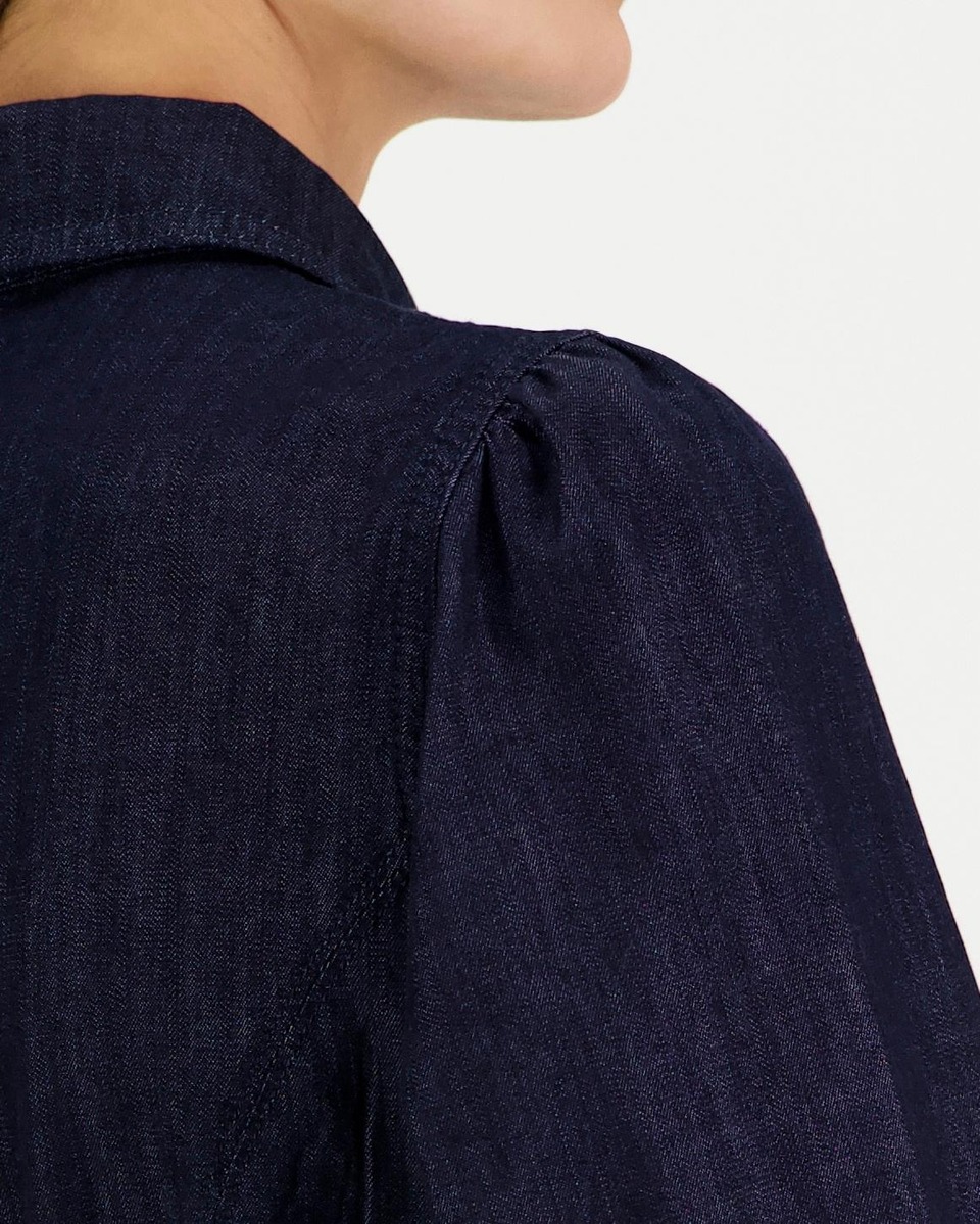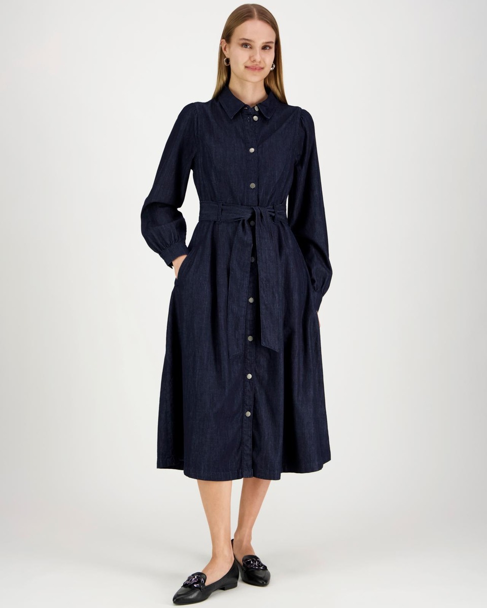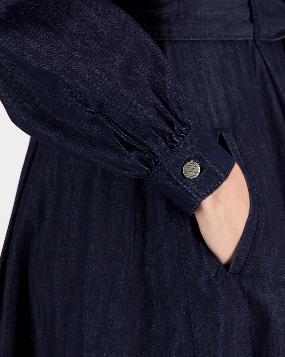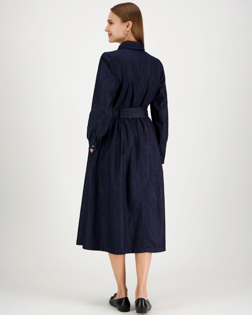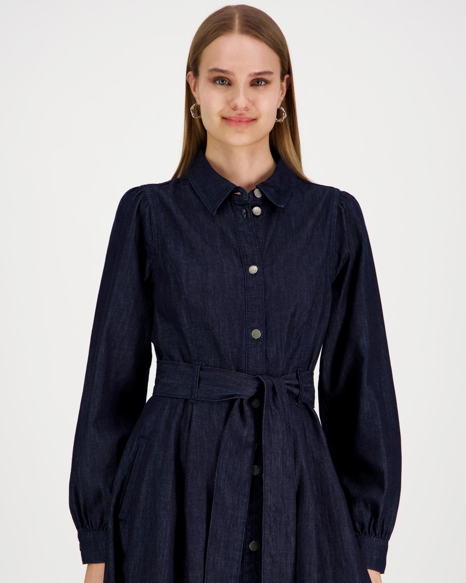 Mid-pituinen denim paitamekko. Kangas pehmeäksi pestyä puuvillaa. Mekossa on irrotettava vyö sekä rennot sivutaskut.