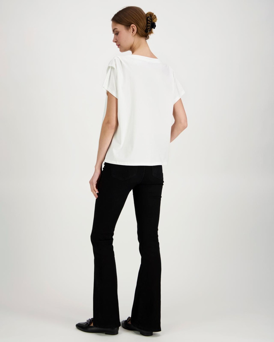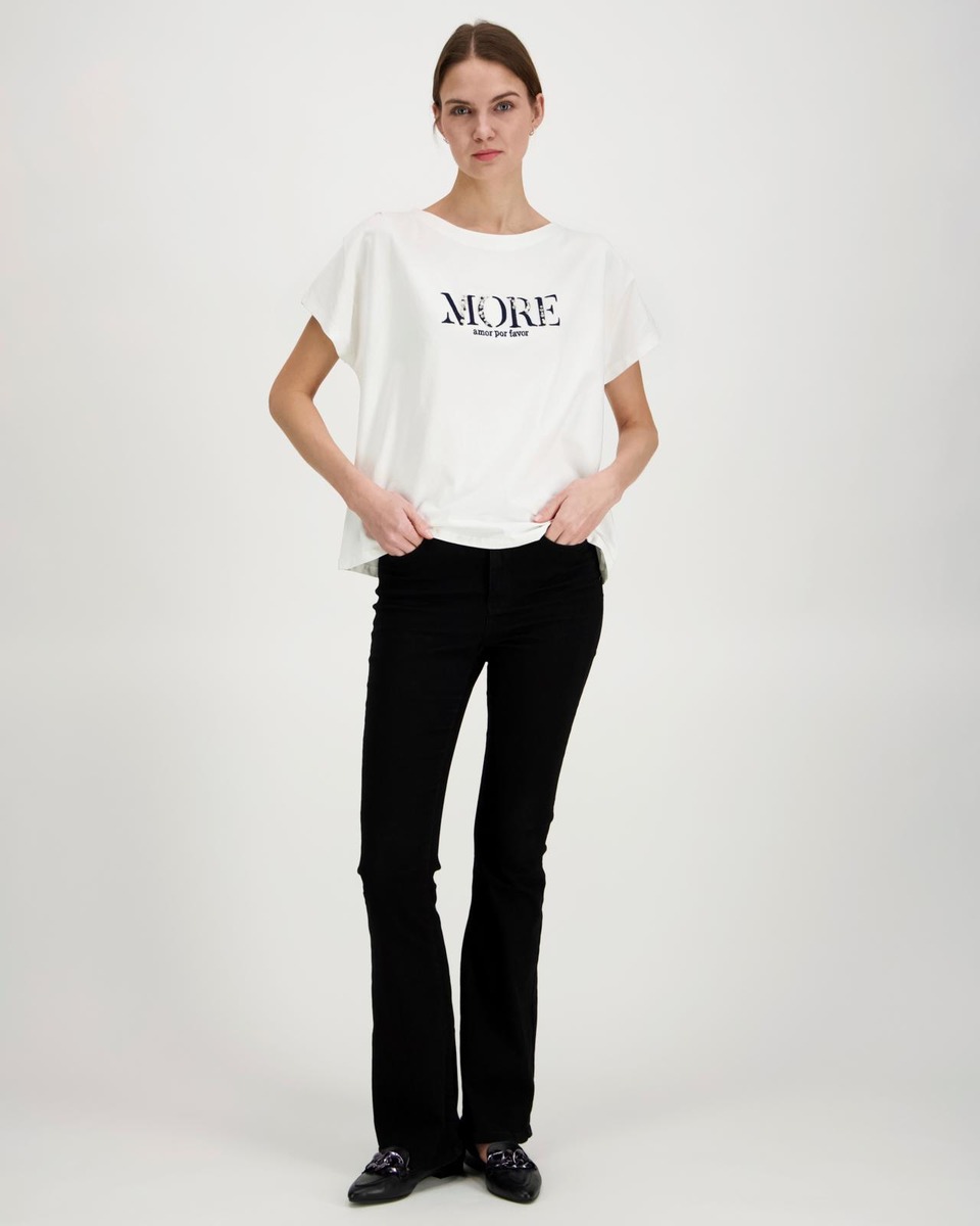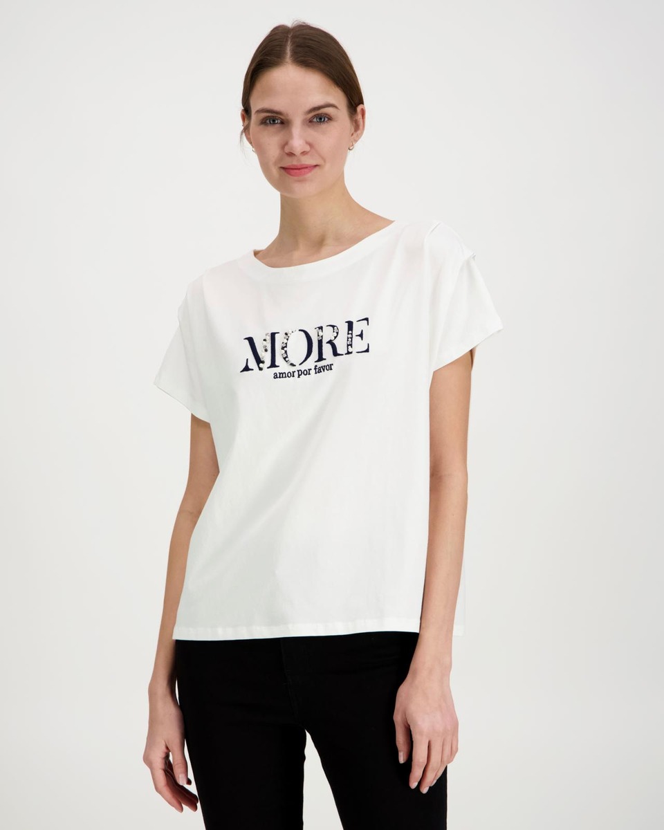 More & Moren oma MORE T-paita, joka on kirjailtu helmin ja strassein. Materiaali miellyttävää orgaanista puuvillaa.