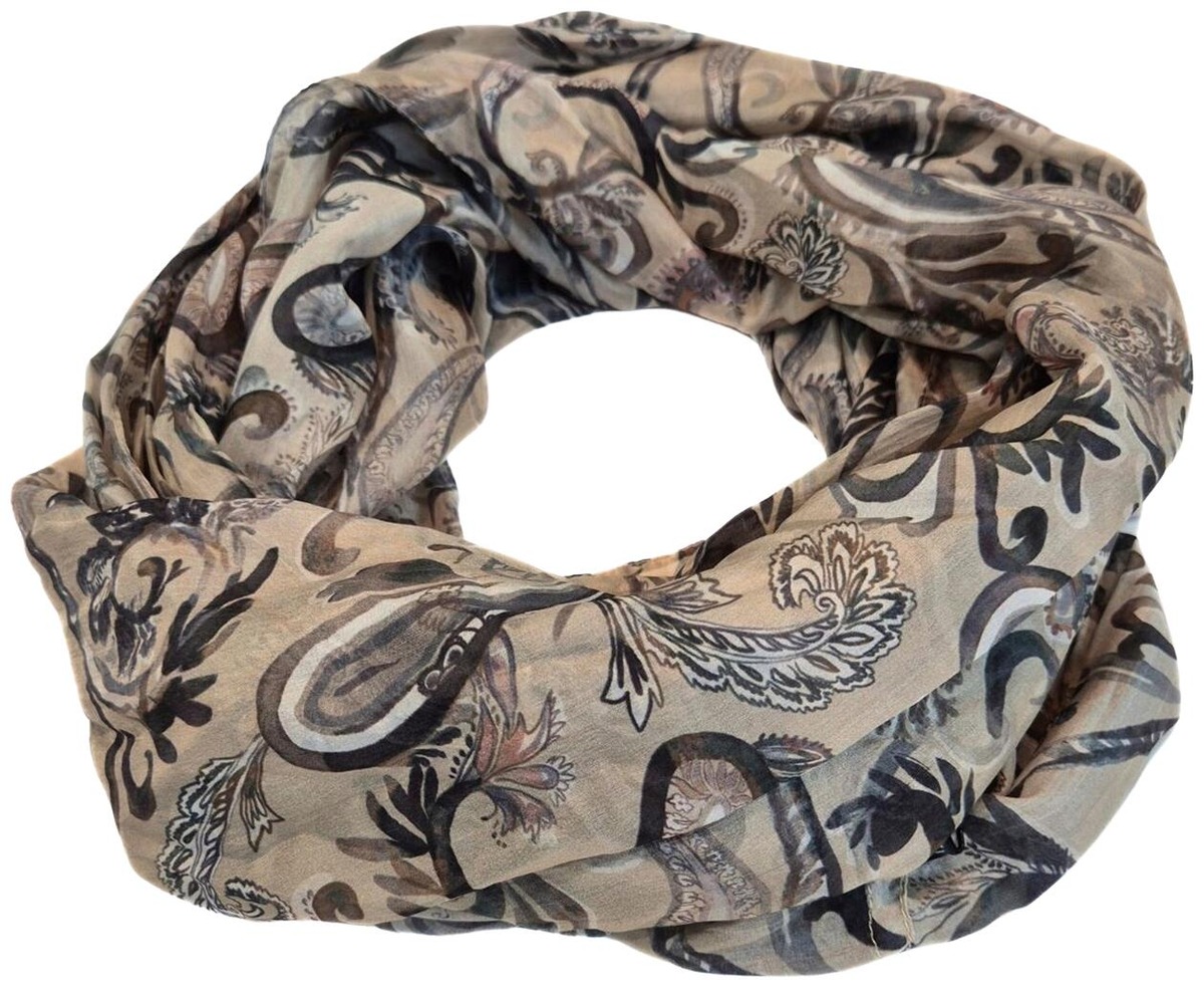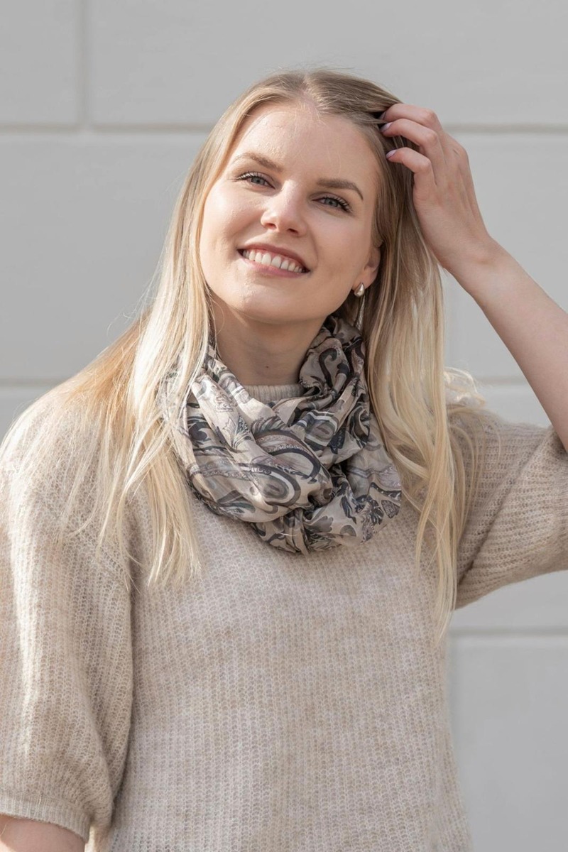 Kevyt helppokäyttöinen tuubihuivi ylellistä silkkiä. Kaunis ajaton paisley-kuosi, jossa pehmeät sävyt.