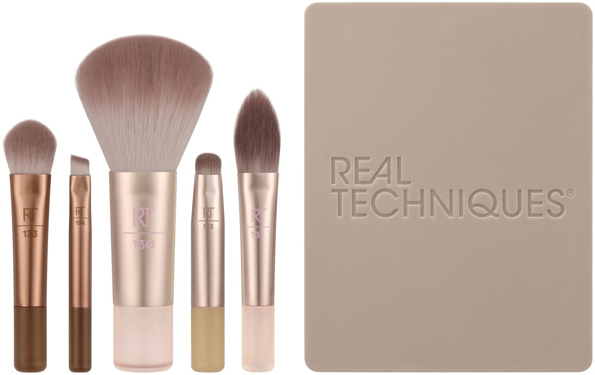 Real Techniques New Nudes 2.0 On-The-Glow Mini Brush Set + Mirrored Compact -meikkisivellinsetti + peili