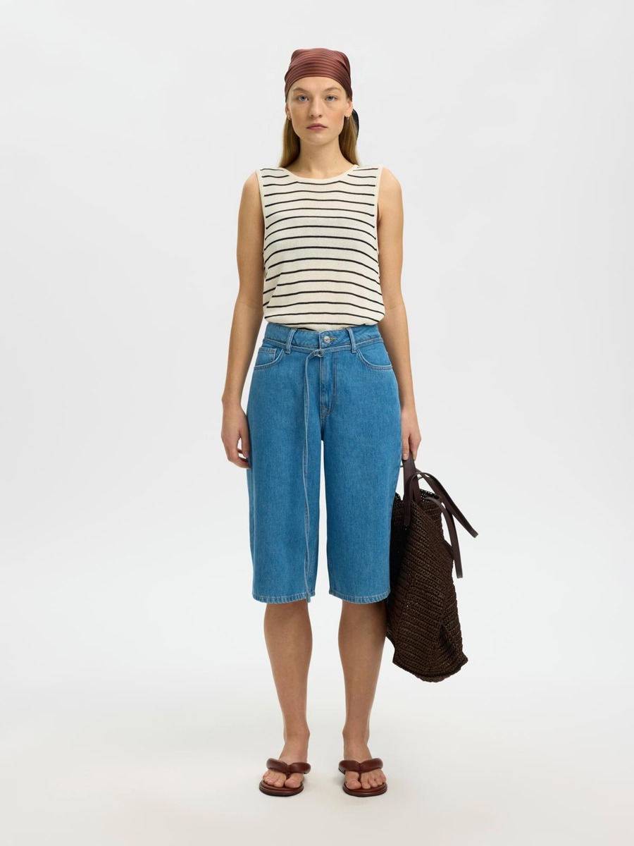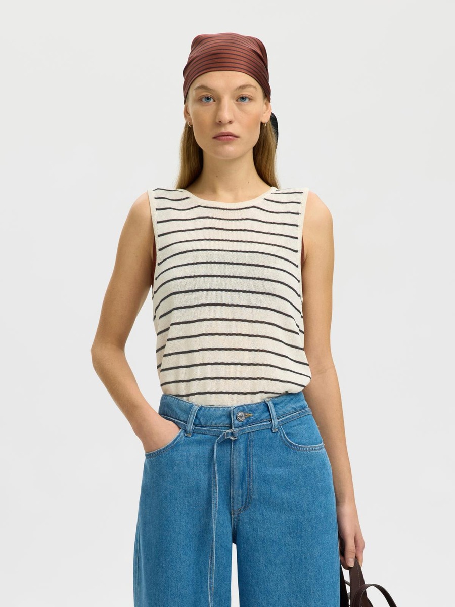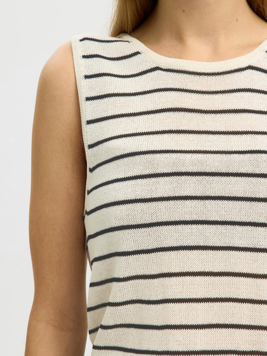 Tämä tyylikäs toppi tarjoaa mukavuutta ja rentoa eleganssia. Pyöreä kaula-aukko ja hihaton muotoilu tekevät siitä täydellisen valinnan lämpimiin päiviin tai kerrospukeutumiseen. Joustavat ribbineulokset helmassa ja kaula-aukossa antavat istuvuutta ja viimeistelevät huolitellun ilmeen. Regular fit -muotoilu takaa miellyttävän, mutta tyylikkään istuvuuden. Täydellinen valinta niin arkeen kuin vapaa-aikaankin.