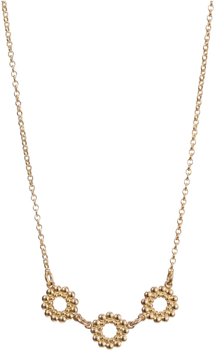Kaulakorussa kolme pyöreää Valoisa-elementtiä on yhdistetty lenkeillä rinnakkain. Koristeiden halkaisija on 11 mm ja ne on kuvioitu molemmin puolin. Kaulakorussa on säädettävä pituus 42/45/50 cm. Suunnittelija Tiina Arkko.