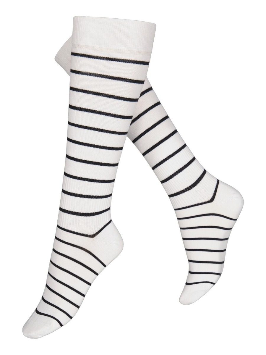 Korkealaatuiset puuvillatukisukat voimakkaalla tuella. Asteittain muuttuva tuki auttaa jalkojasi pysymään virkeinä ja tuntumaan kevyiltä koko päivän riippumatta siitä vietätkö sen istuen, seisten vai matkustaen. Polvisukissa on leikkisä raitakuvio.