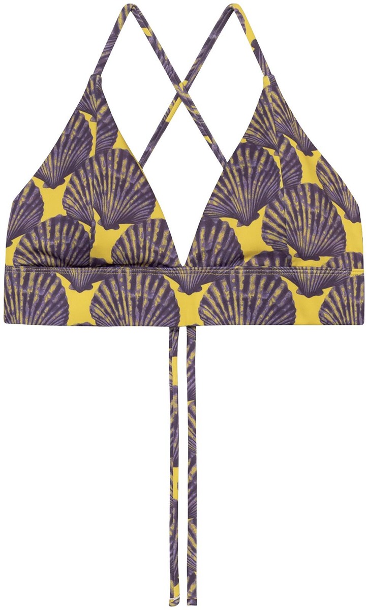 Tyylikäs kolmiomallinen bikinitoppi, jossa leveä nauha rinnan alla ja kevyesti tukeva rakenne sivusaumassa. Selässä ristiin menevät nauhat, jotka solmitaan taakse. Irrotettavat kupit . Bikinhousut löydät mallinumerolla 23357