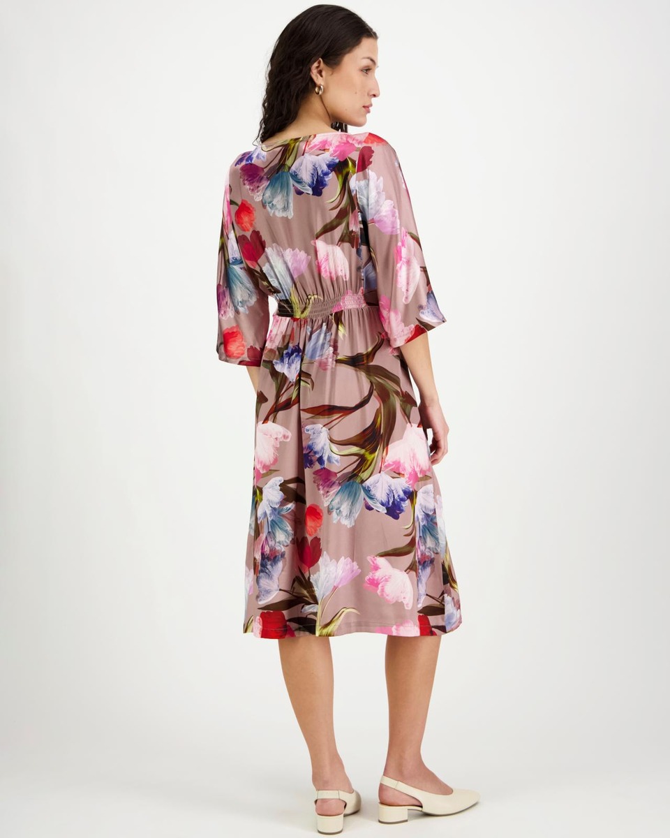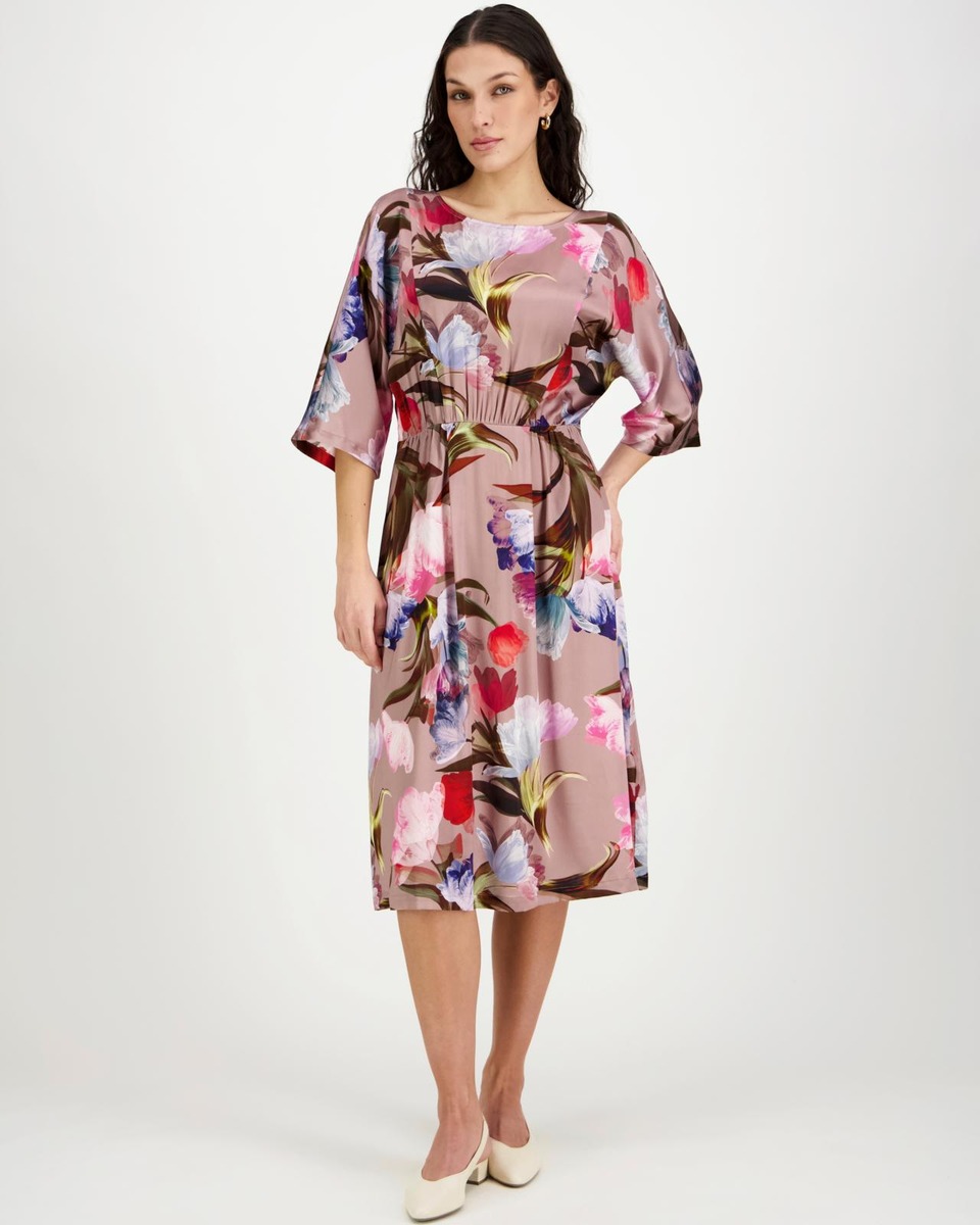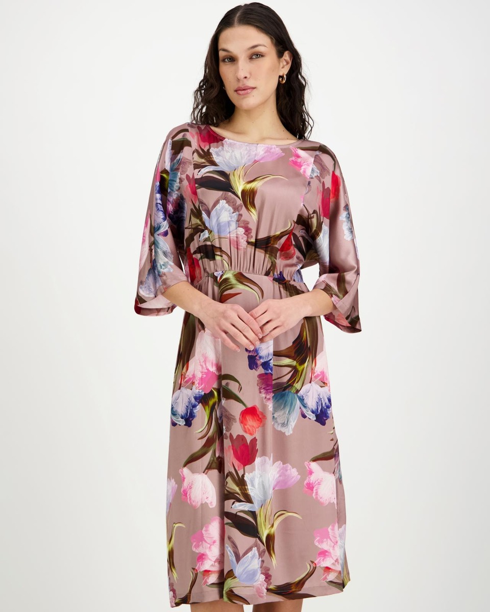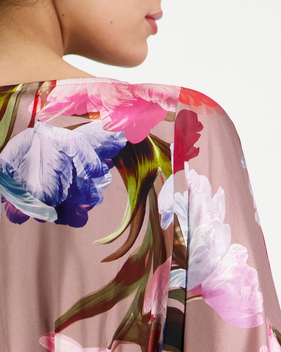 Naisellinen stretch-silkkimekko, jossa upea kukka printti. Edessä kauniisti rintojen yli kulkevat pystylinjaiset leikkaukset ja vyötäröllä kauniisti laskostettu kaareva sauma. Hihat ovat leppakkomaisesti leikatut ja hihansuihin kapenevat. Takana joustava kuminauha vyötäröllä. Mekon helma levenee alaspäin. Materiaali on erittäin miellyttävä ja helppohoitoinen.