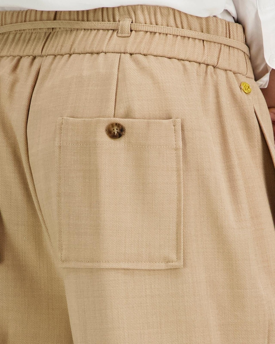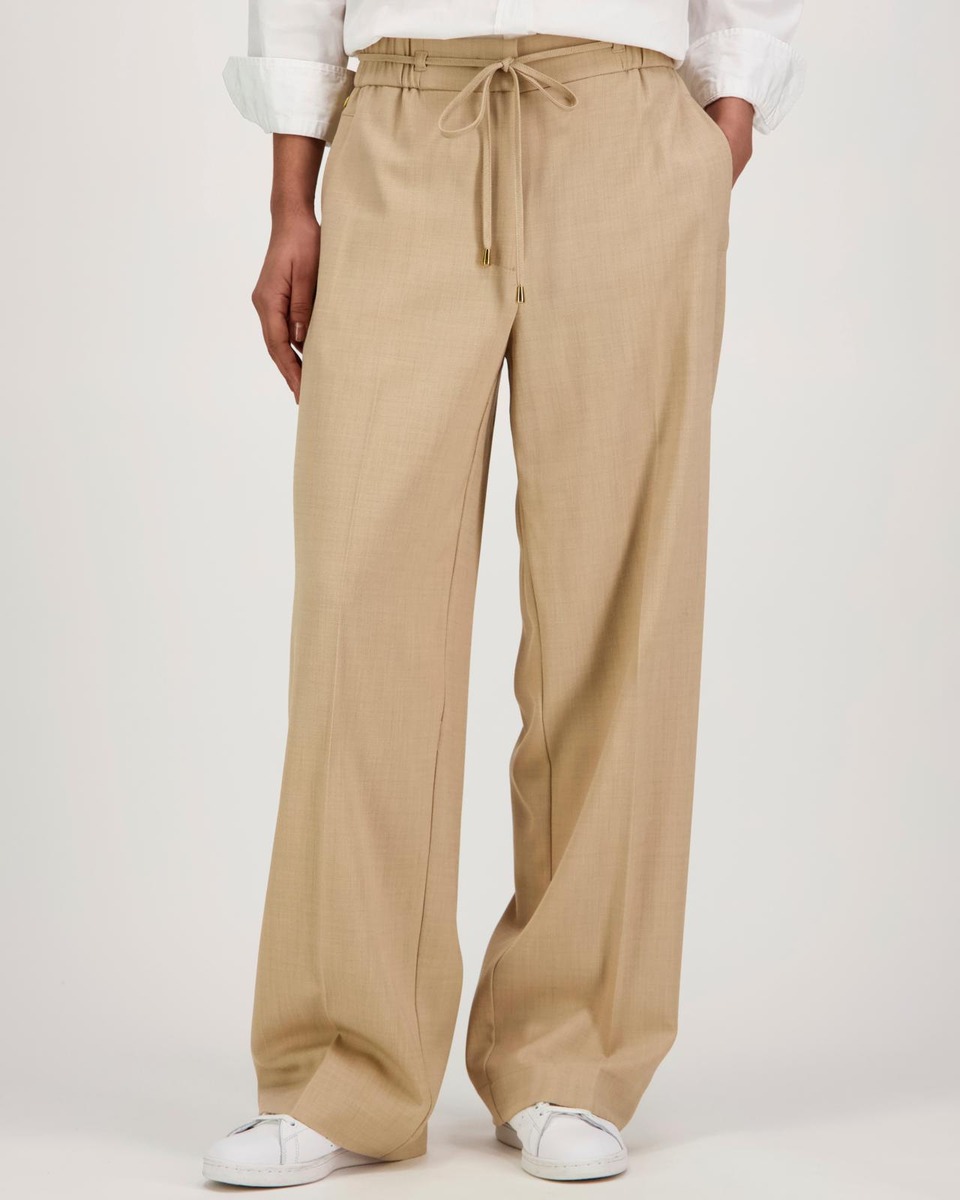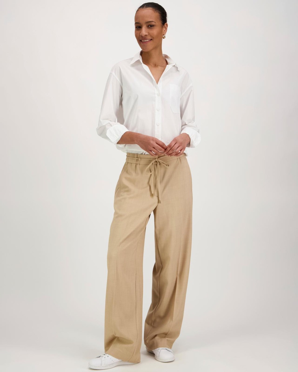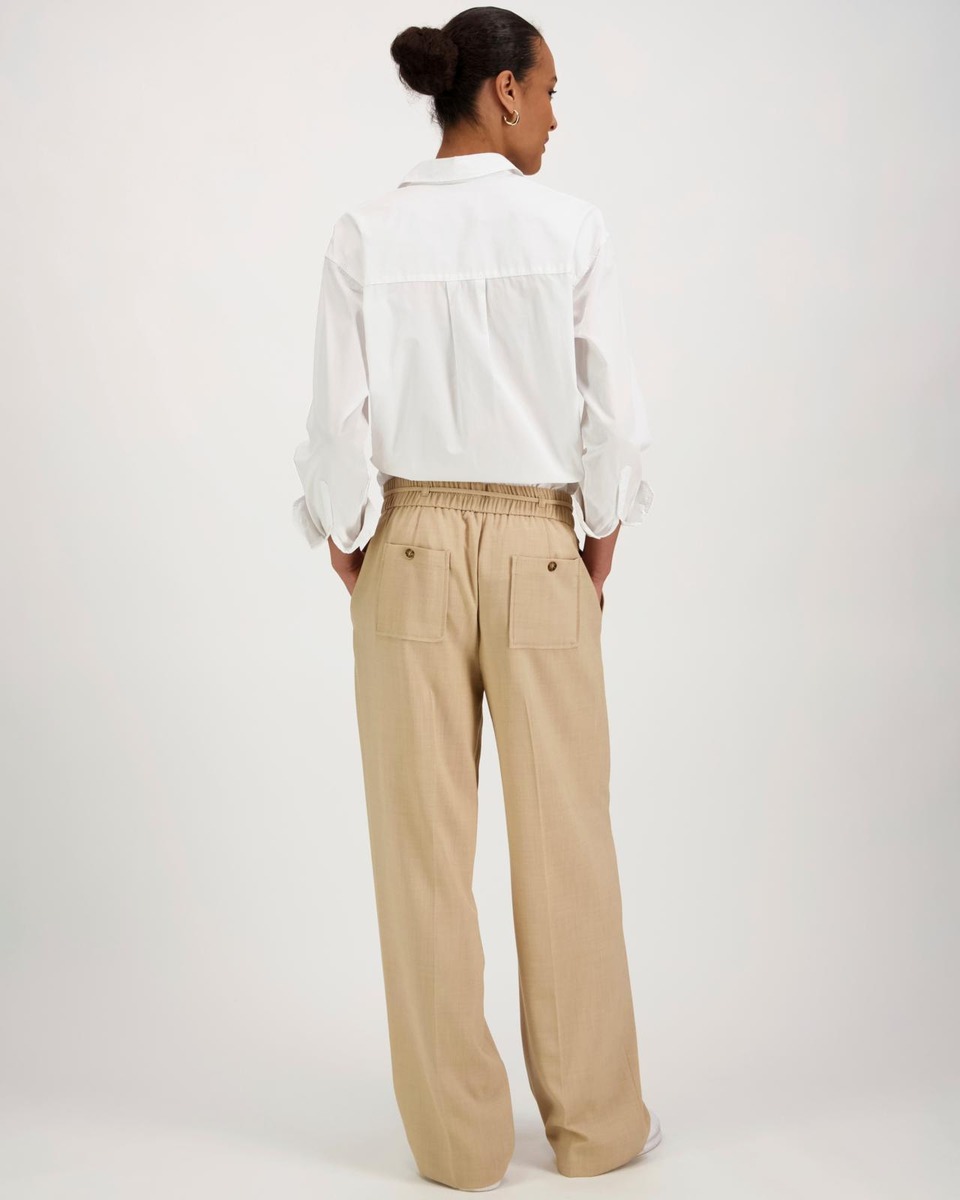 Leveät hieman alaspäin kapenevat housut, joissa lähes koko vyötärön ympäri ulottuva joustava housunkaulus. Vyötäröllä nyöri, jonka saa tarvittaessa pois. Takana rennot napilliset paikkataskut. Helppohoitoinen ja kauniisti laskeutuva kangas.