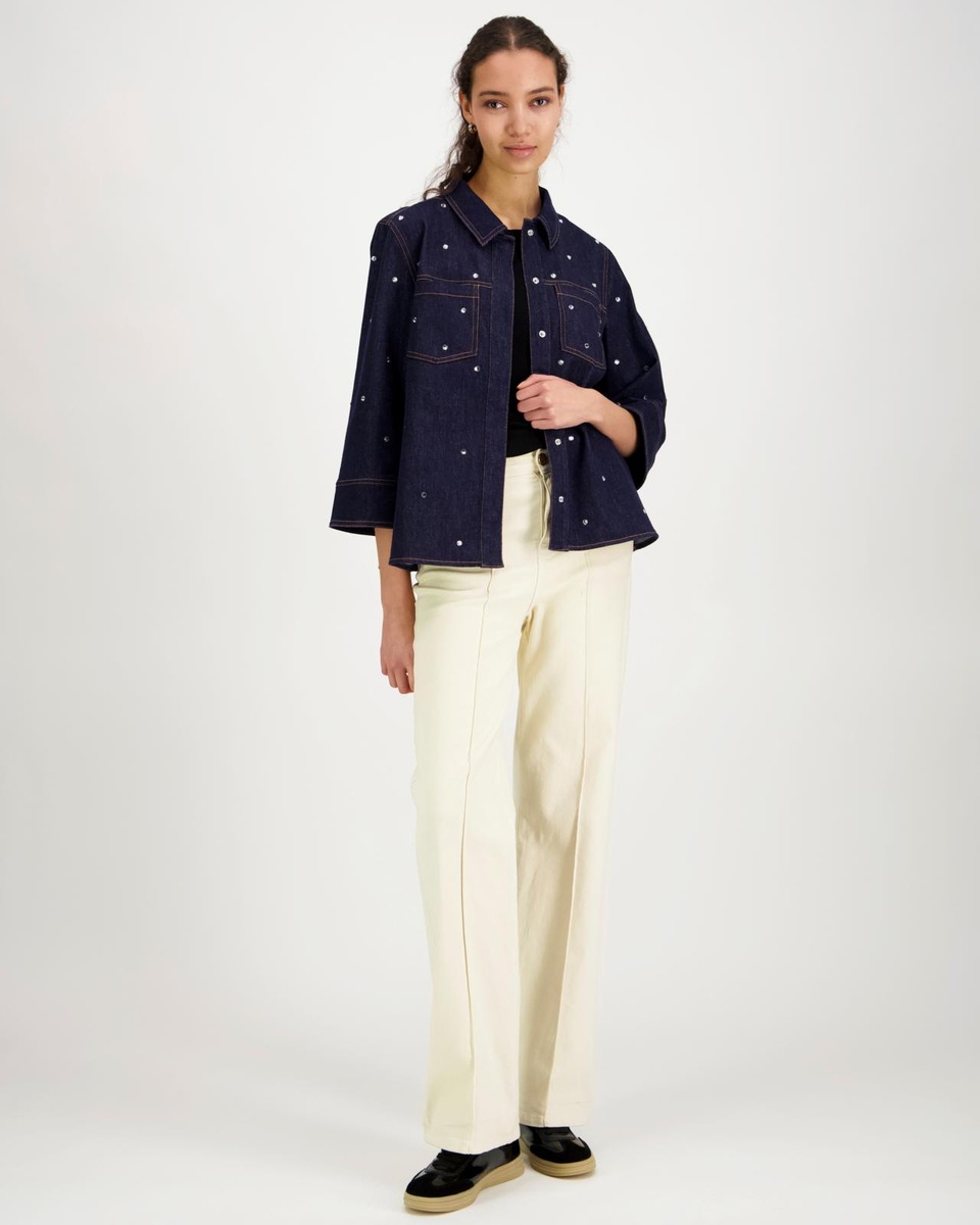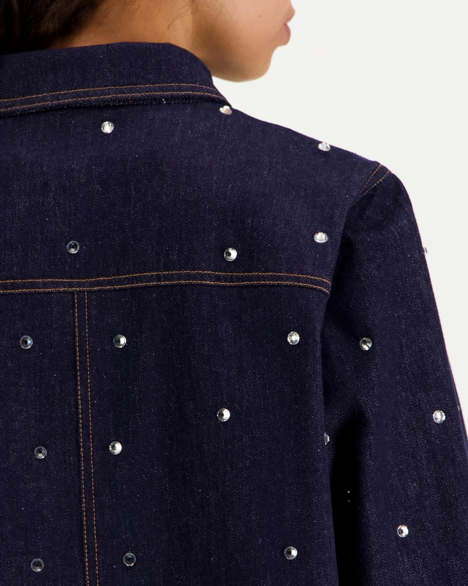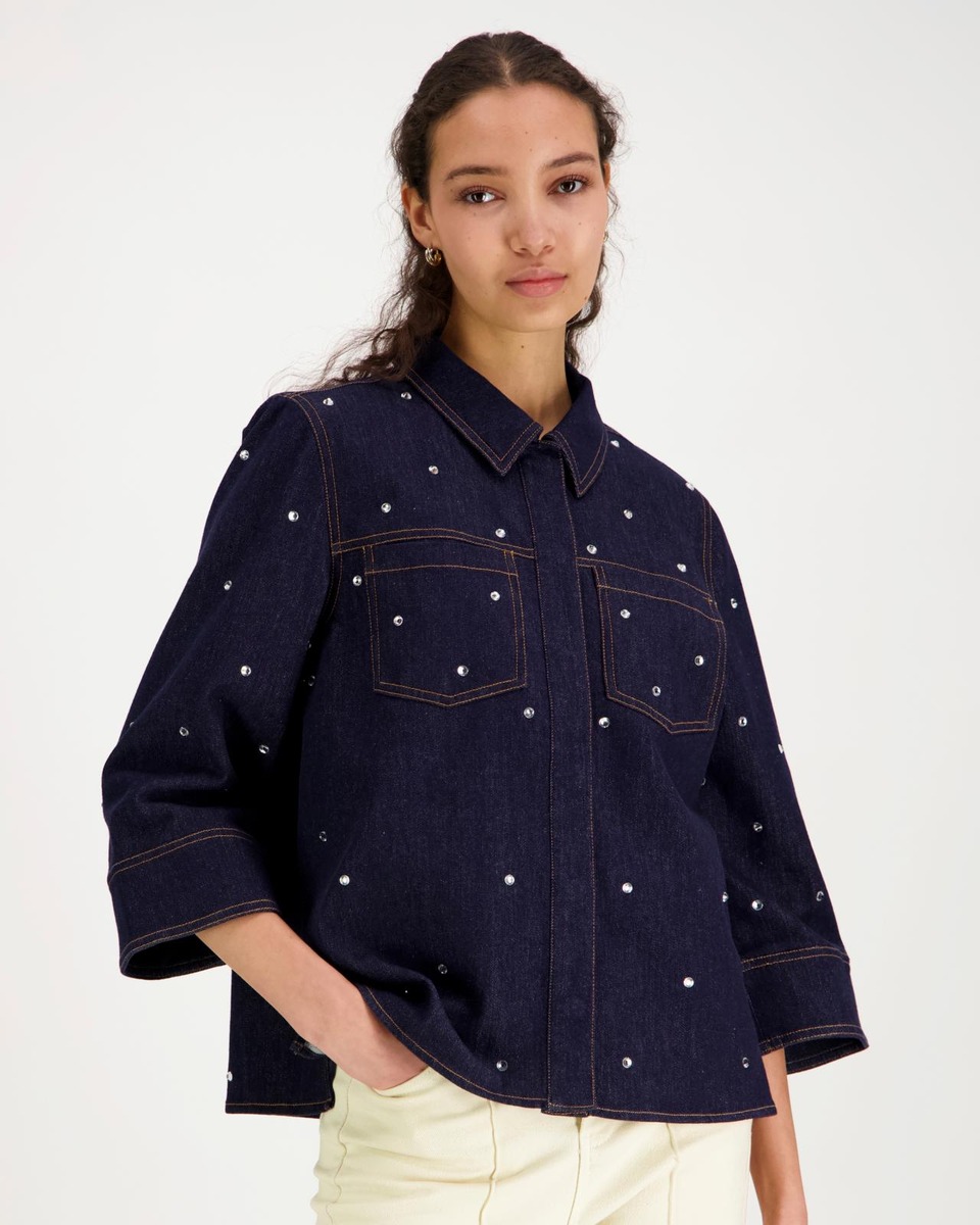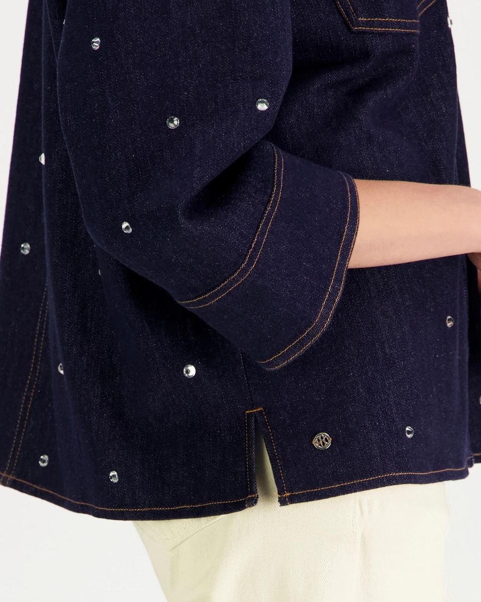 Näyttävä paljetein koristeltu farkkupaita, jossa vajaamittaiset hihat ja rintataskut. Materiaali erittäin miellyttävää ja hyvin laskeutuvaa puuvilla-elastaania. Malli suora ja väljähkö.