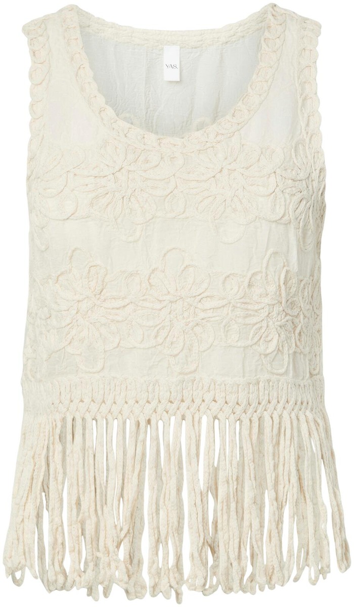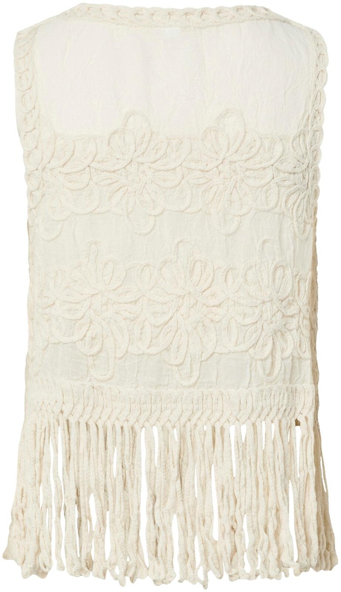 Tuo boheemia eleganssia kesätyyliisi tällä upealla hihattomalla pitsitopilla! Toppi on valmistettu kevyestä ja hengittävästä materiaalista, joka tuntuu miellyttävältä ihoa vasten. Kauniit kukkakuvioiset pitsiyksityiskohdat luovat romanttisen ilmeen, ja näyttävä hapsuhelma lisää asuun leikkisyyttä ja liikettä.