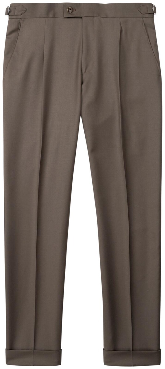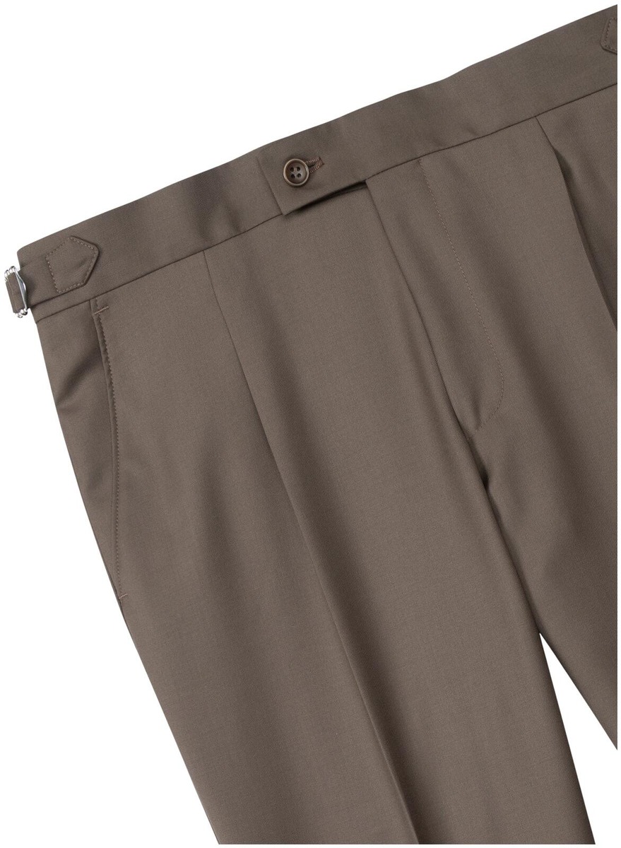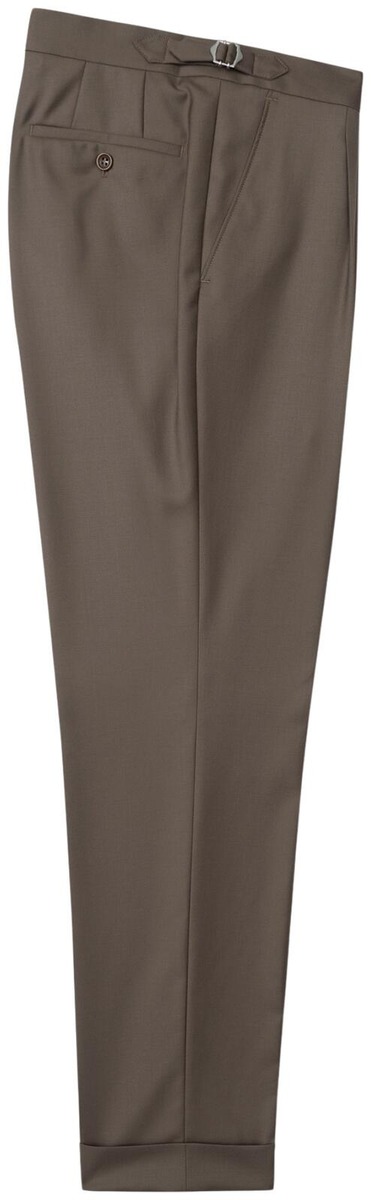 Puvunhousut, jotka on yhdistettävissä näyttävän kaksirivisen Jan 7574 puvuntakin kanssa. Kankaan vaaleanruskea väri on täysin ainutlaatuinen ja sen on ensiluokkaisesta merinovillasta kutonut italialainen Vitale Barberis Canonico. Slim fit -leikkaus on suunniteltu istumaan arvokkaasti hoikalle tai urheilulliselle keholle. Takin pituus koossa 52 on 76cm.