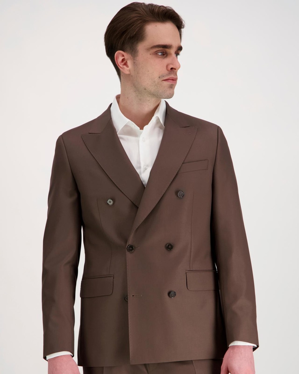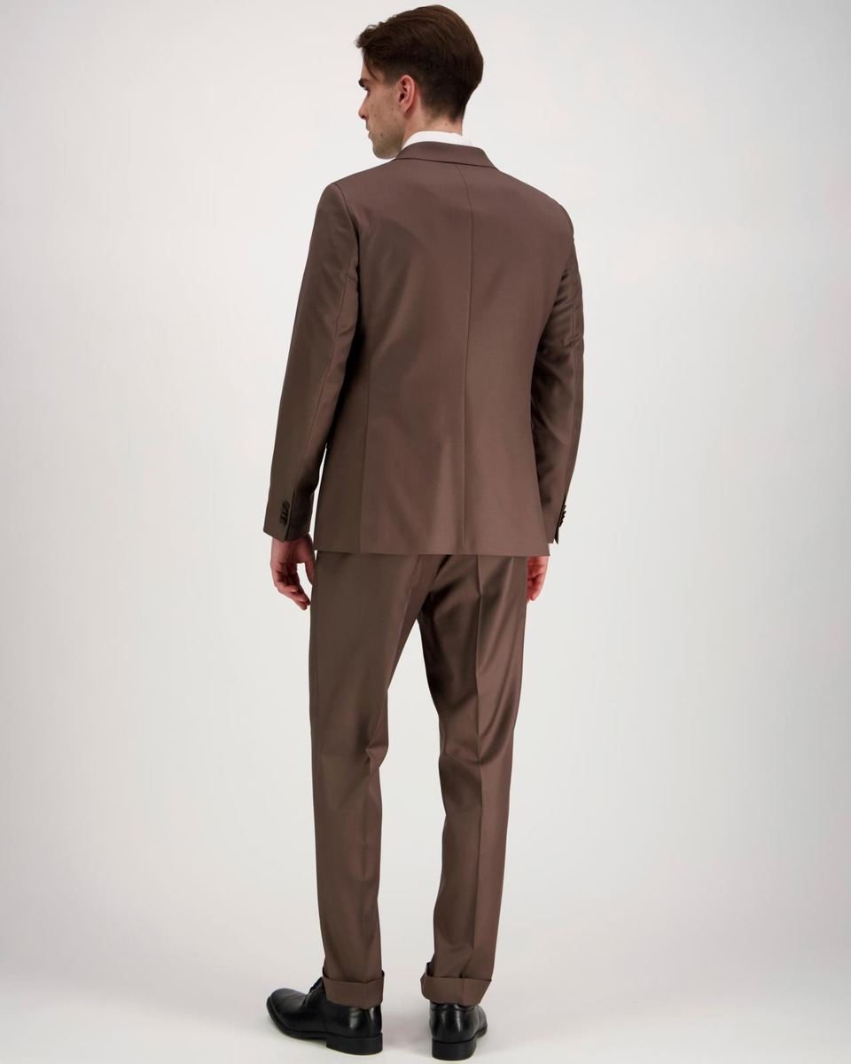 Yhdistä tämä kaksirivinen puvuntakki Hanko 7574 -housujen kanssa ja puku on yksi tämän vuoden näyttävimmistä. Kankaan vaaleanruskea väri on täysin ainutlaatuinen ja sen on ensiluokkaisesta merinovillasta kutonut italialainen Vitale Barberis Canonico. Slim fit -leikkaus on suunniteltu istumaan arvokkaasti hoikalle tai urheilulliselle keholle. Takin pituus koossa 52 on 76cm.