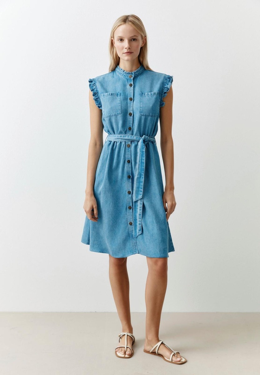 Raikas ja naisellinen farkkumekko, jossa on napitus edessä ja sievät röyhelöhihat.Mekkoon kuuluu myös vyö. Saatavana vain verkkokaupasta.