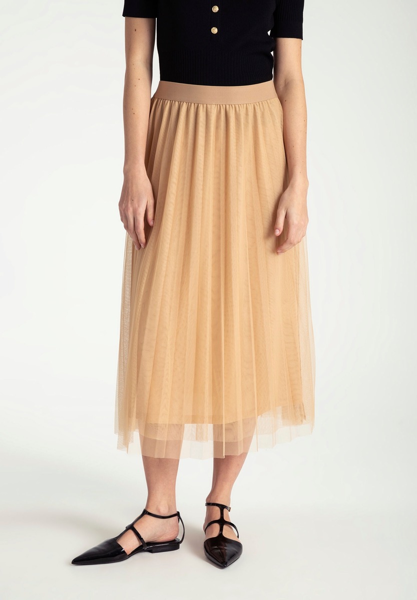 Kevyt ja ilmava mesh-hame , jossa on joustava vyötärö ja kauniisti laskeutuva helma. Helppo yhdistää arkeen ja juhlaan- tuo asuun ripaus keveyttä ja eleganssia.