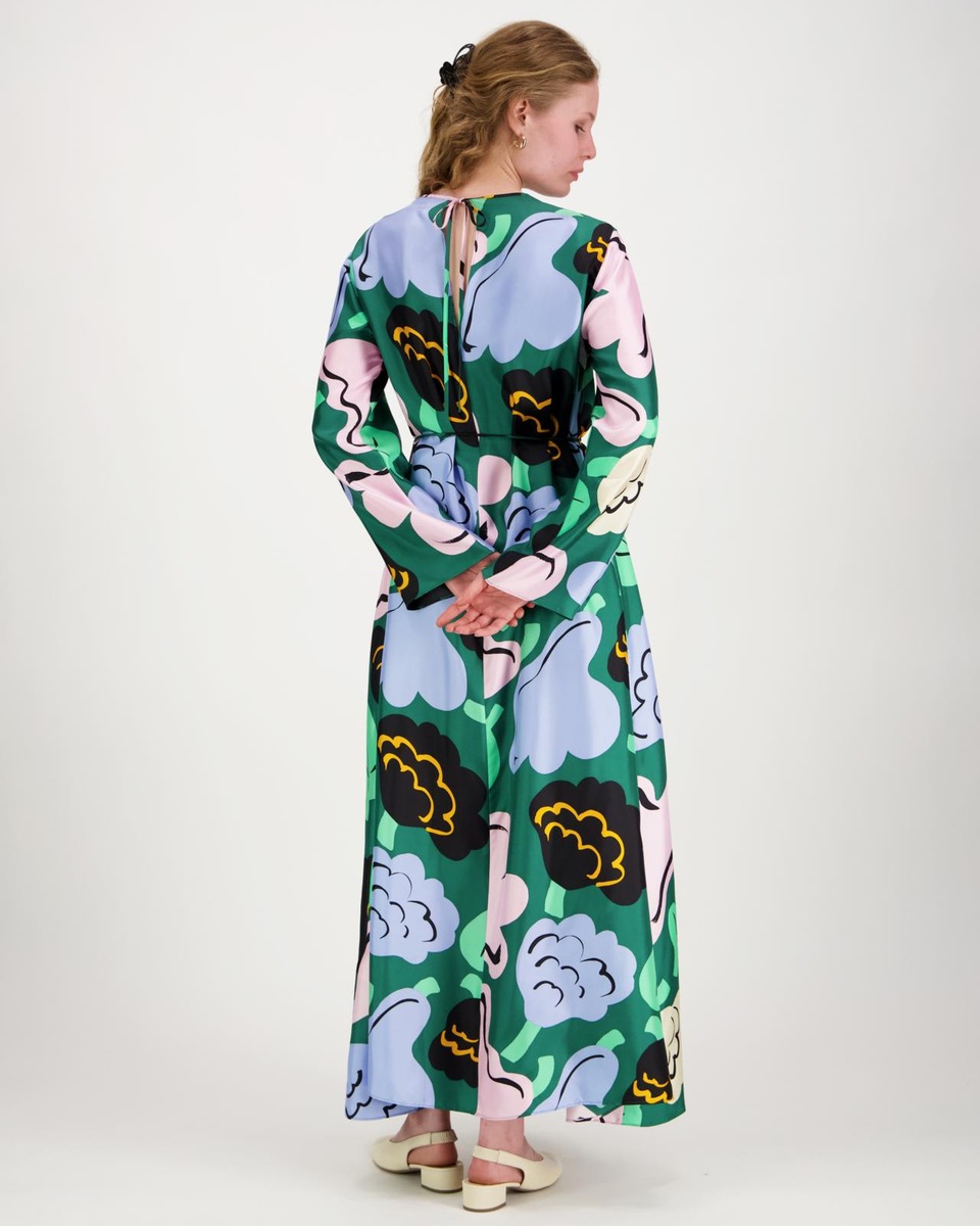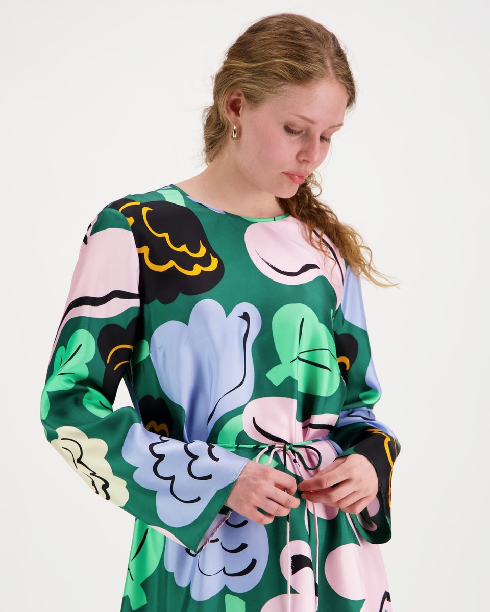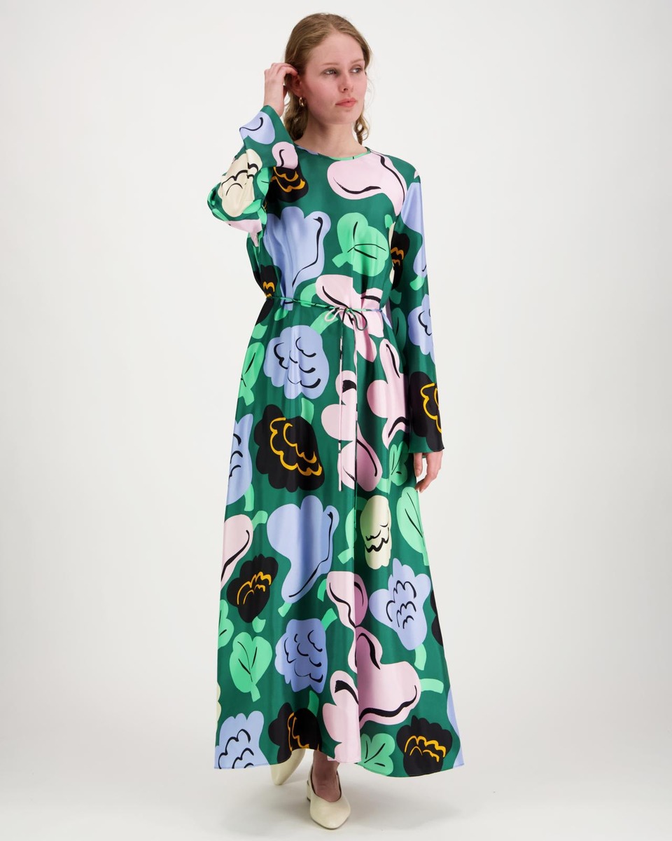 Kaunista-silkkimekossa on niukka istuvuus, A-linjainen leikkaus sekä Kukasta kukkaan -kuosi. Mekossa on pyöreä pääntie edessä ja syvä V-halkio sekä sidottavat nauhat takapääntiellä. Mekossa on suorat pitkät hihat, sivusaumataskut ja kapea irrallinen vyö. Rintamuotolaskokset antavat vaatteelle paremman istuvuuden.Tuote on valmistettu 100-prosenttisesta silkistä.Mekot on leikattu koko kankaan leveydeltä, minkä vuoksi niiden ulkoasu saattaa hieman vaihdella. Jokainen tuote on yksilö.Erja Hirvi loi iloisesti kukkivan Kukasta kukkaan -kuvion kesäpaikassaan torpan lattialla, täysin kukka-aiheisiin uppoutuneena. Väljästi suunniteltu kuvio muotoutui maalatessa ja heijastelee kukkien lukemattomia asentoja luonnossa. Kuosin nimi viittaa mehiläisten leikkisään lentoon kesäkukkien keskellä.