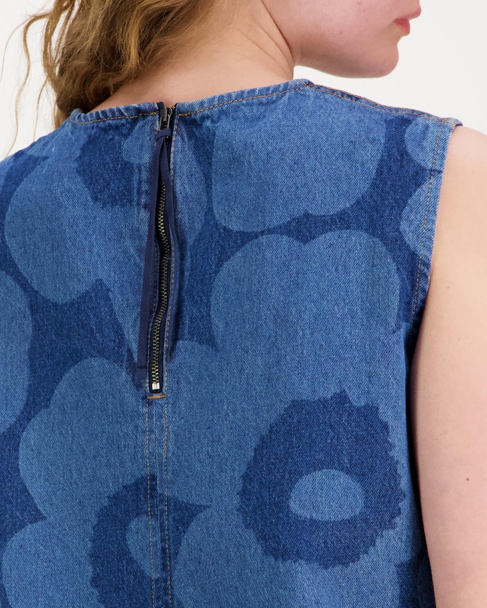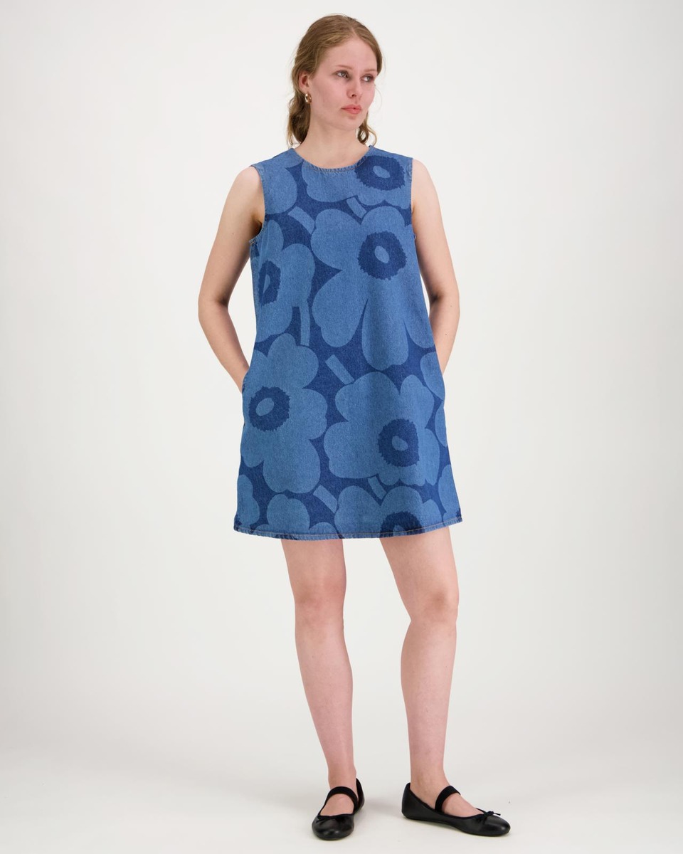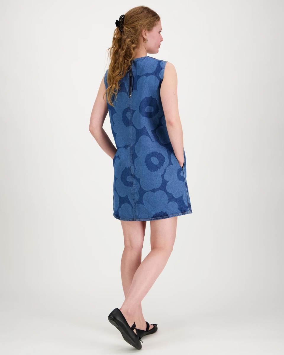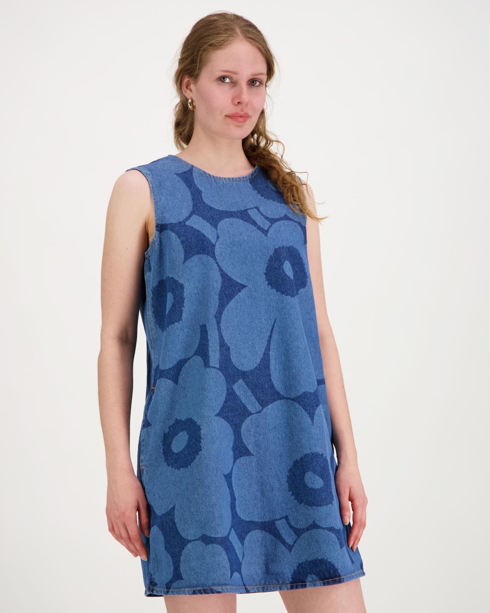 Sininen Maridenim Somasti -mekko on valmistettu puuvillakankaasta, ja siinä on niukka istuvuus, A-linjainen leikkaus sekä Unikko-kuosi. Hihattomassa mekossa on pyöreä pääntie ja takasaumassa metallivetoketju, jossa on pitkä ripsinauhavedin. Sivusaumoissa on taskut.Marimekko Maridenim -tuotteet on suunniteltu noudattaen kiertotaloutta edistävän Ellen MacArthur -säätiön Jeans Redesign -ohjeita. Ohjeiden mukaisesti farkkumateriaali on täyttä puuvillaa (80 % luomupuuvillaa ja 20 % kierrätettyä puuvillaa) eikä sisällä elastaania. Lisäksi tuotteissa ei käytetä ylimääräisiä metalliosia ja napit ovat irrotettavia. Myös tuotteiden pesu, viimeistely ja kemikaalien käyttö noudattavat ohjeita, ja tuotteiden värisävyjen, kuvioiden ja halutun tunnun tuottamiseen käytämme muun muassa lasertekniikkaa, E-Flow -höyrypesua sekä otsonipesua emmekä esimerkiksi perinteistä kivipesua.Maridenim tuotteissa on erityinen viimeistely ja patina, mikä antaa jokaiselle tuotteelle ainutlaatuisen, yksilöllisen ilmeen. Tämä ominaisuus on osa Maridenim-tuotteiden viehätystä ja kiinnostavuutta.