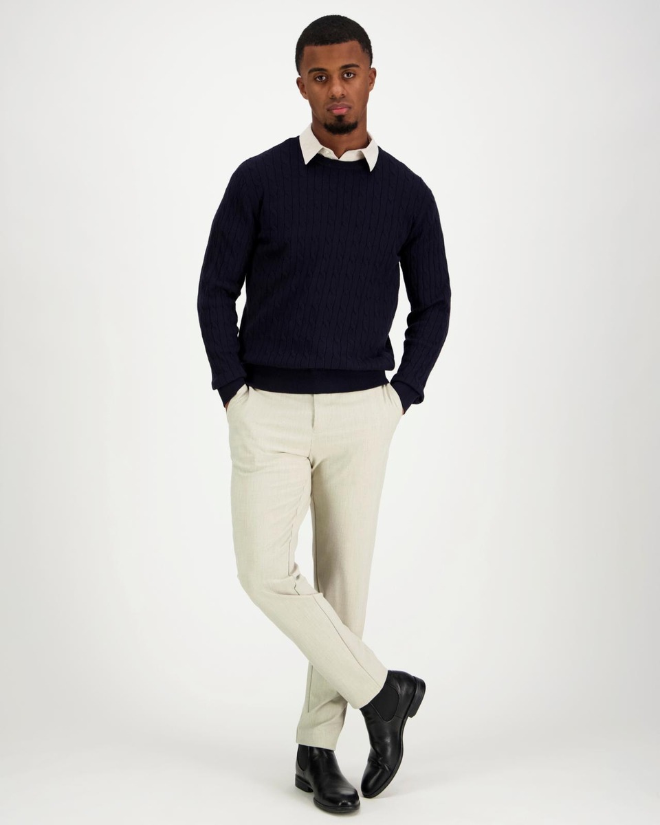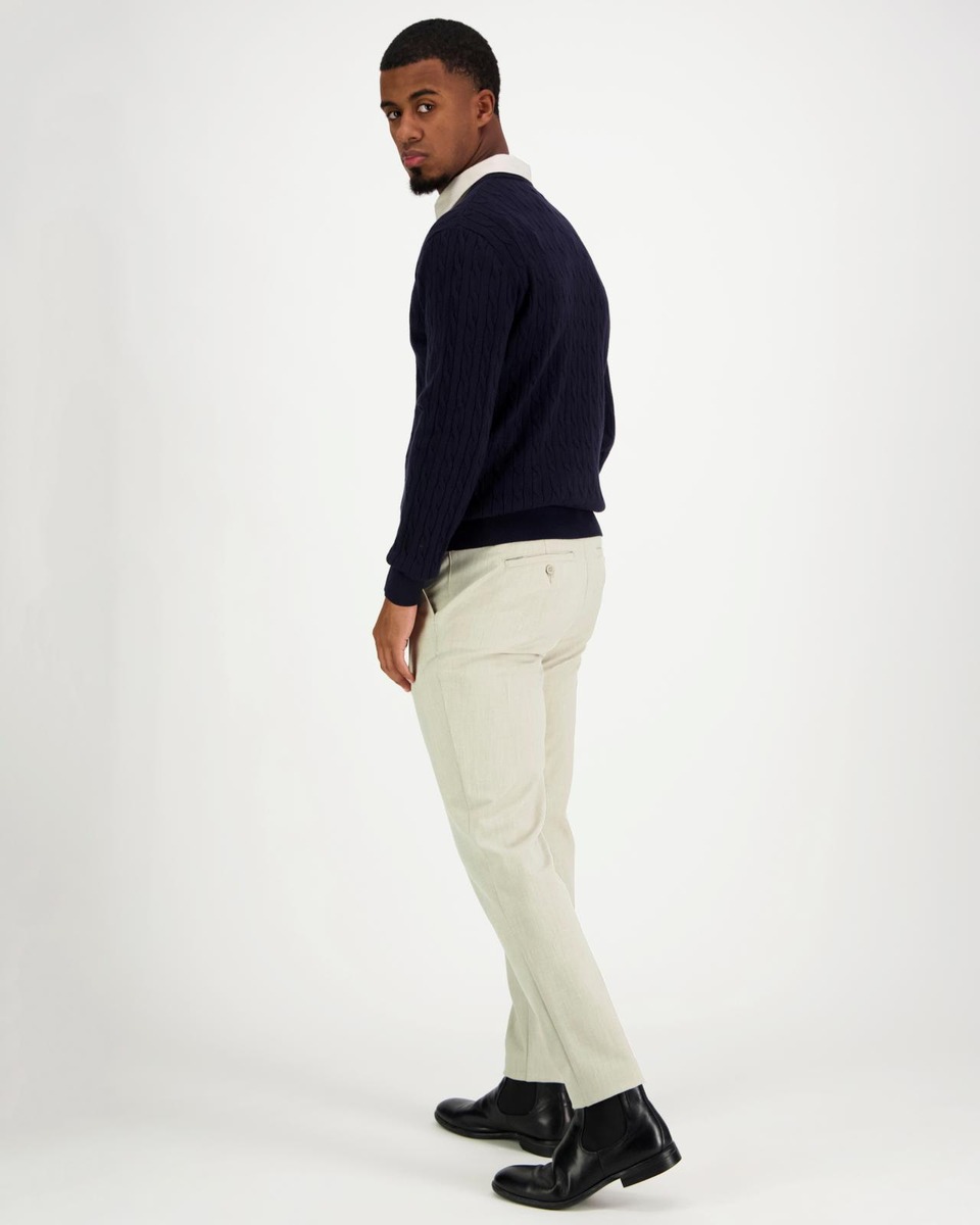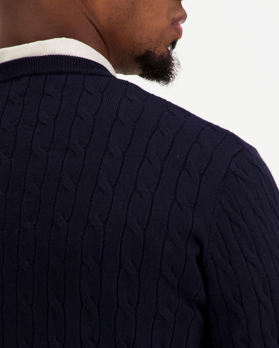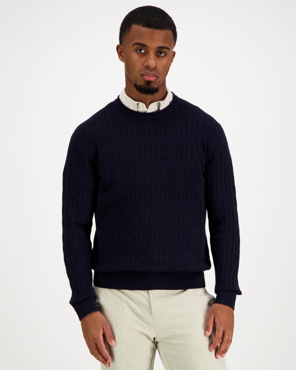 Puuvilla-kshmirista valmistettu palmikkoneule. Pääntiellä, helmassa ja hihansuissa on resorineulosta.