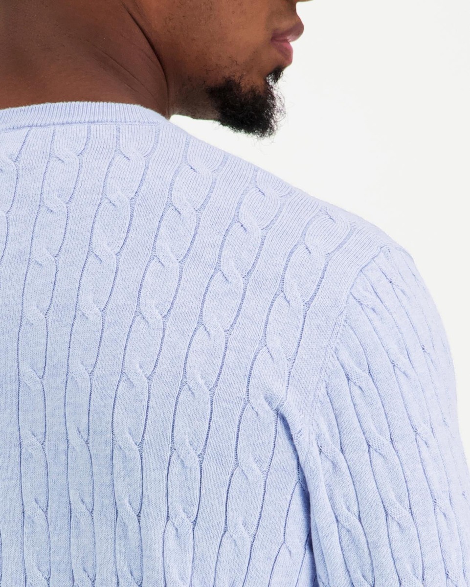 Puuvilla-kshmirista valmistettu palmikkoneule. Pääntiellä, helmassa ja hihansuissa on resorineulosta.