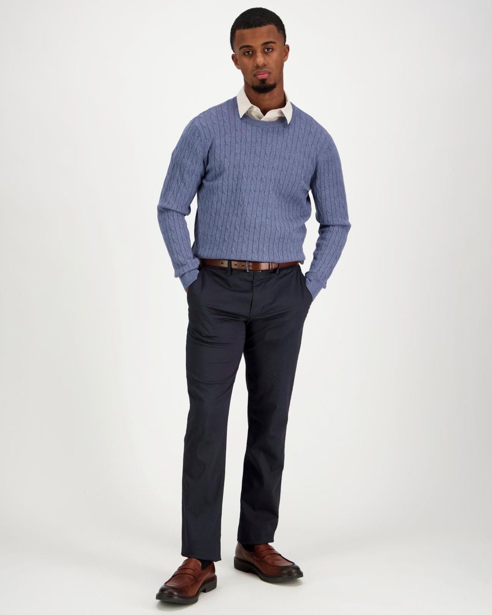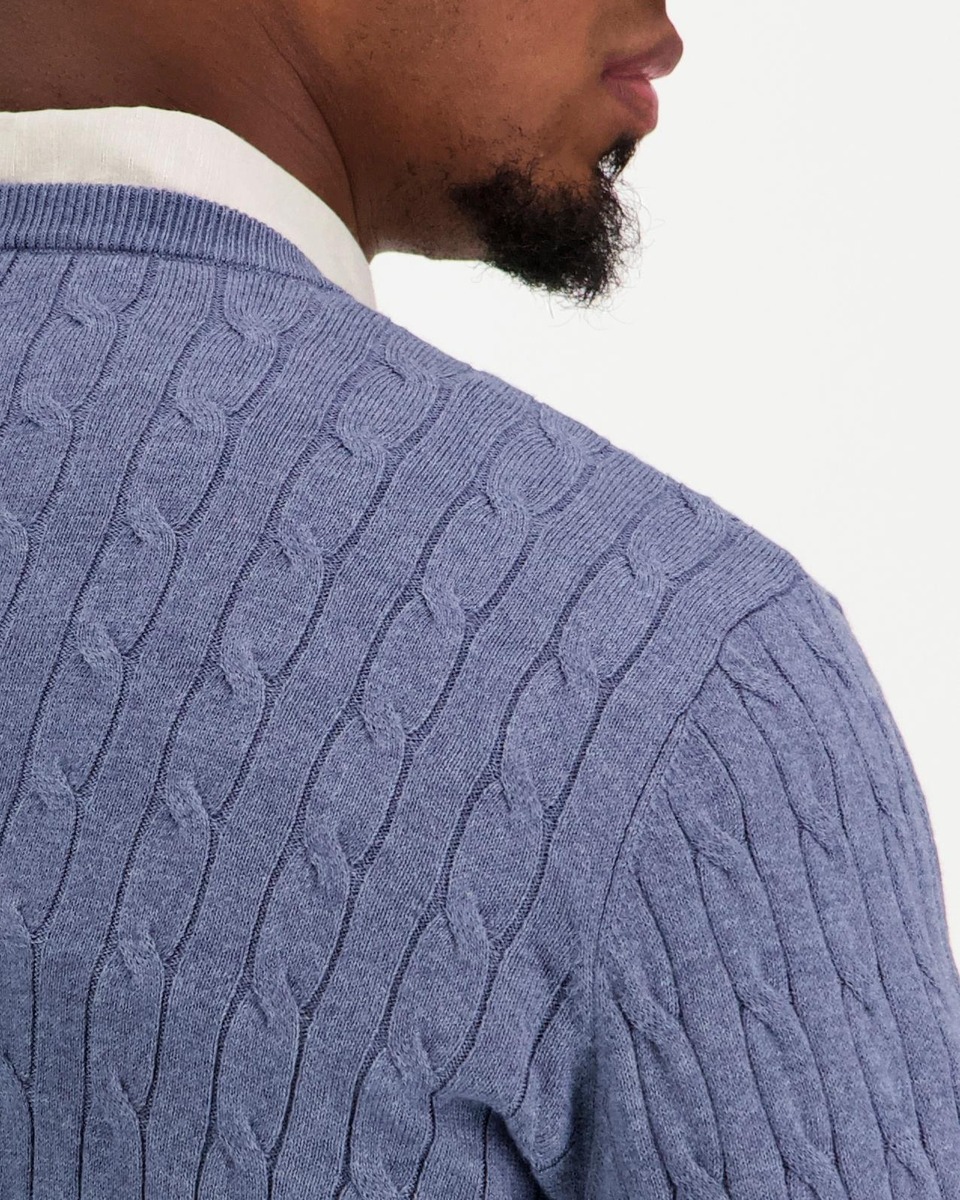 Puuvilla-kshmirista valmistettu palmikkoneule. Pääntiellä, helmassa ja hihansuissa on resorineulosta.