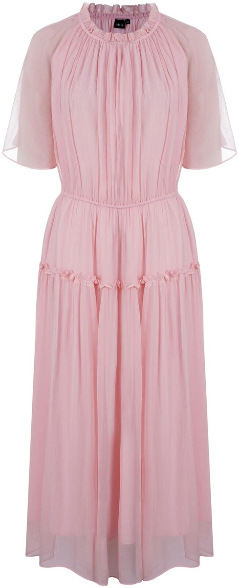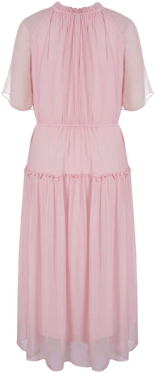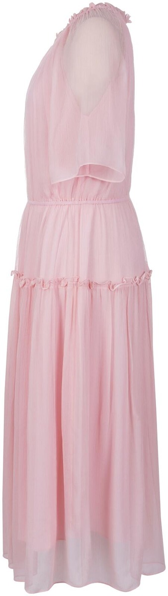 Lyhythihainen ja pohjemittainen mekko, jossa on joustava, rypytetty O-pääntie. Tätä väljänmallista mekkoa rytmittää joustovyötärö ja koristaa röyhelösomiste lantion korkeudella. Päällysmateriaalina on läpikuultava ja ilmava 100-prosenttinen viskoosi ja body on vuoritettu. Takapituus on 120 cm koossa 36.