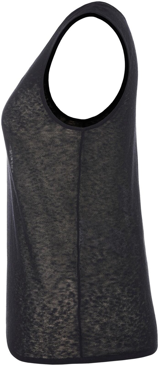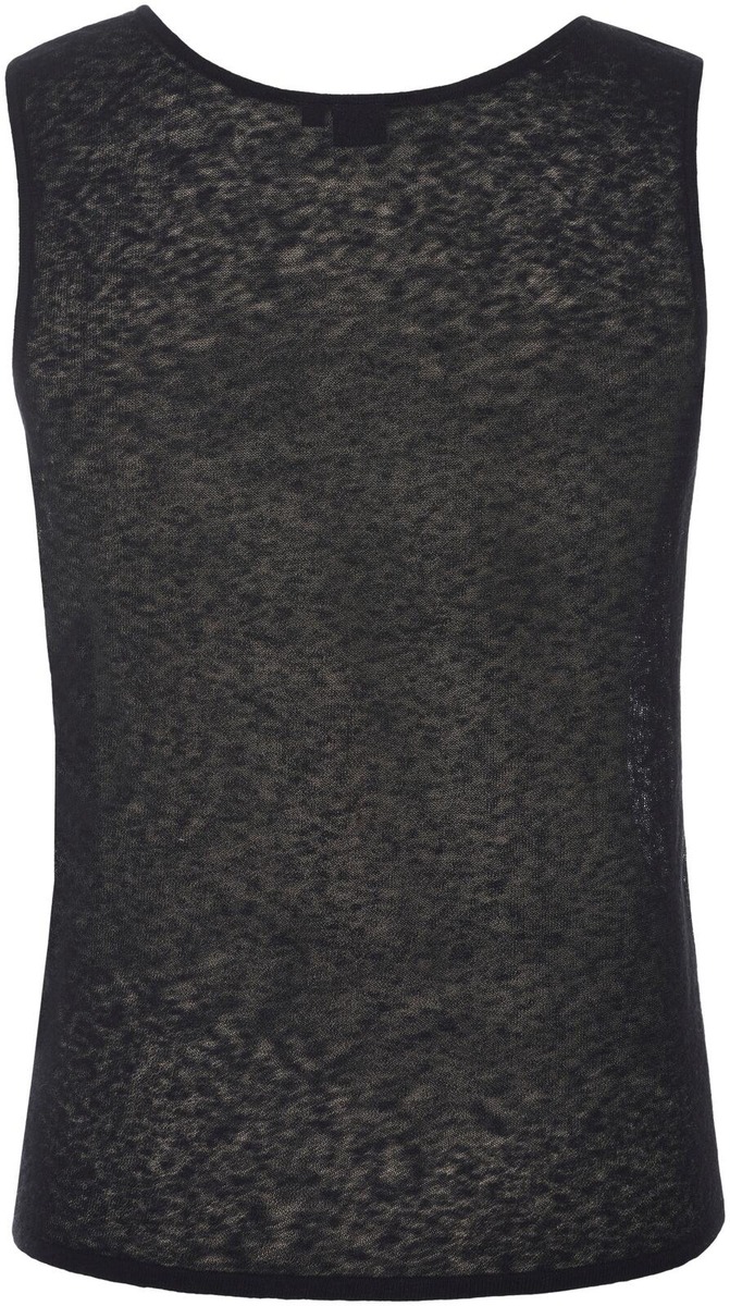 Läpikuultavan ohuessa neuletopissa on syvään uurrettu pyöreä pääntie. Materiaalina on ihastuttava monikuitusekoite, joka sisältää mm puuvillaa ja pellavaa. Takapituus on 56 cm koossa M.