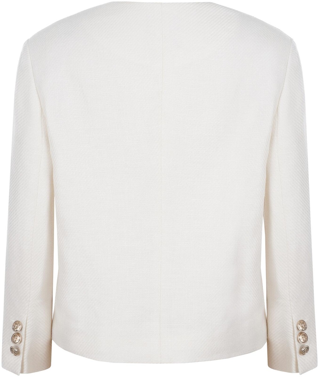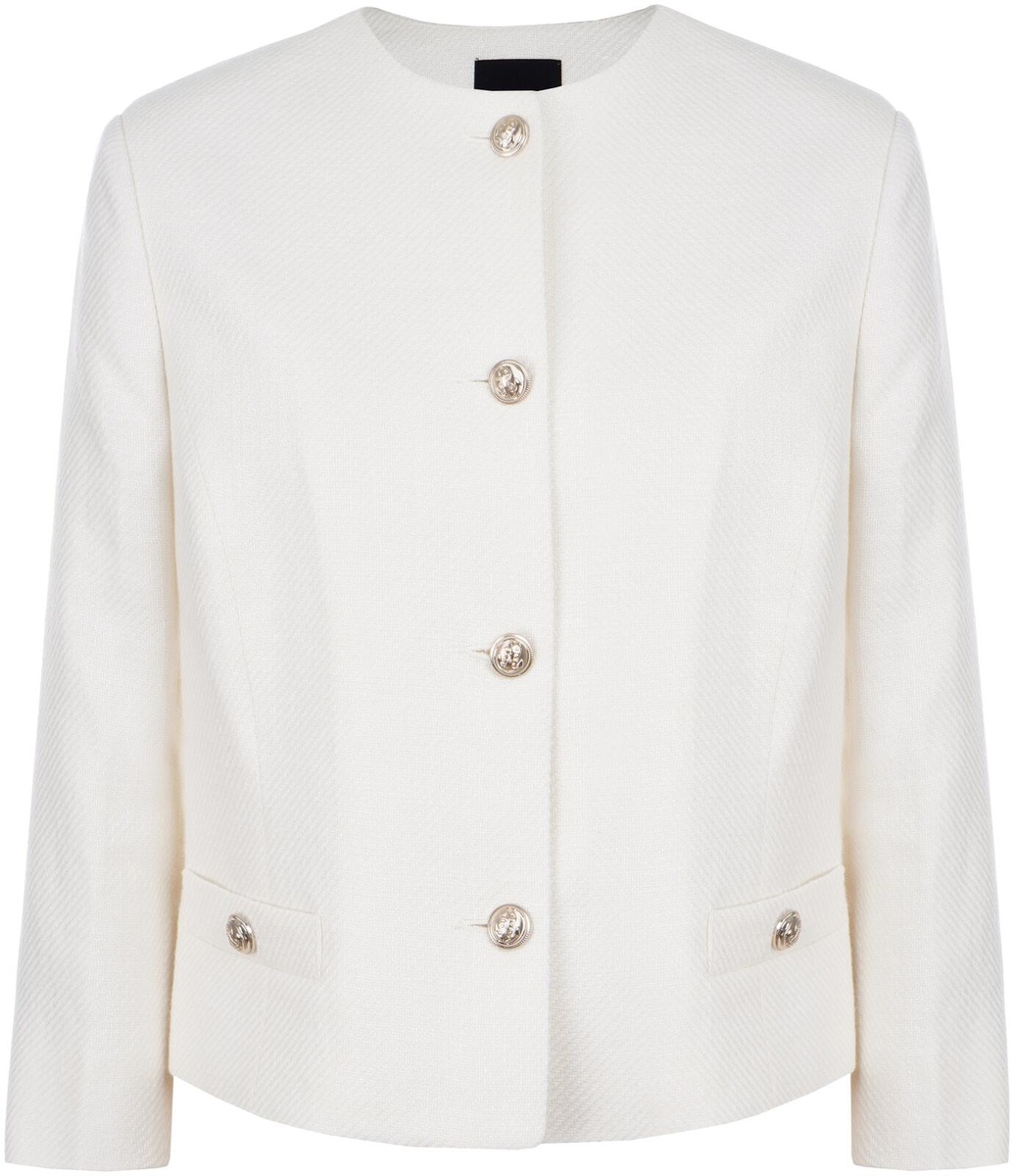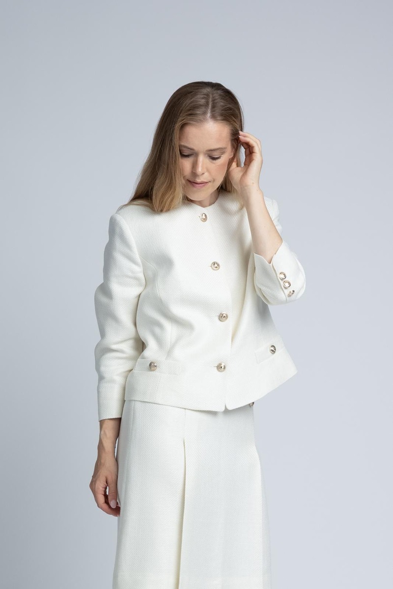 Suoralinjainen ja lyhyt chanel-tyyppinen jakku, jossa on kaulukseton O-pääntie. Tämän kauniin, struktuuripintaisen jakun katseenvangitsijoina ovat kiiltävät, metalliset ankkurinapit. Materiaali on laadukasta pellavan ja villan sekoitetta ja vuori miellyttävää asetaattia. Takapituus on 50 cm koossa 36.