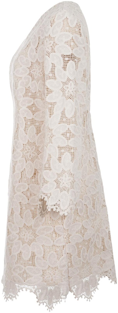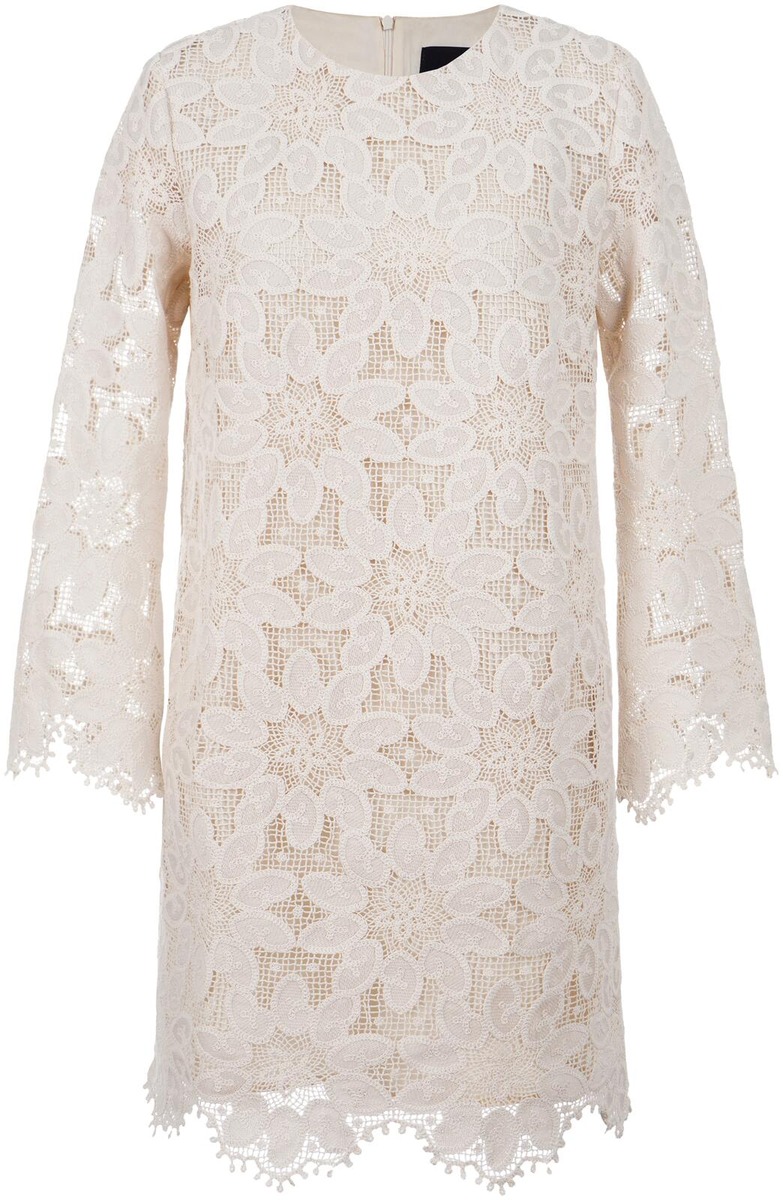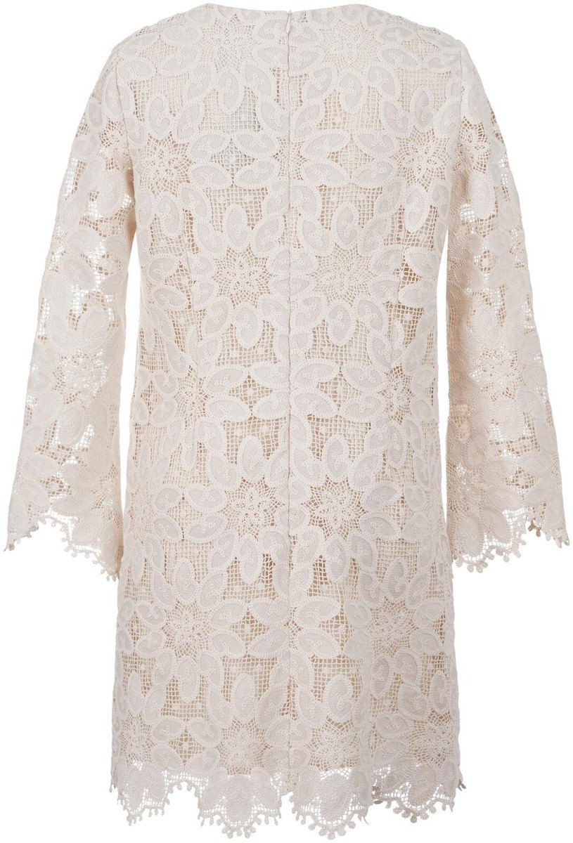 Kaunis suoranmallinen, virkattu pitsimekko, jossa on polven yläpuolelle ulottuva helma. Naisellisuutta korostavat läpikuultavat, trumpettimalliset hihat ja pitsireunuksinen helma. Miehustaa peittää käytössä miellyttävä asetaattivuori. Mallissa on sievä, pyöreä pääntie ja takana piilovetoketjukiinnitys. Mekon takapituus on 92 cm koossa 36.