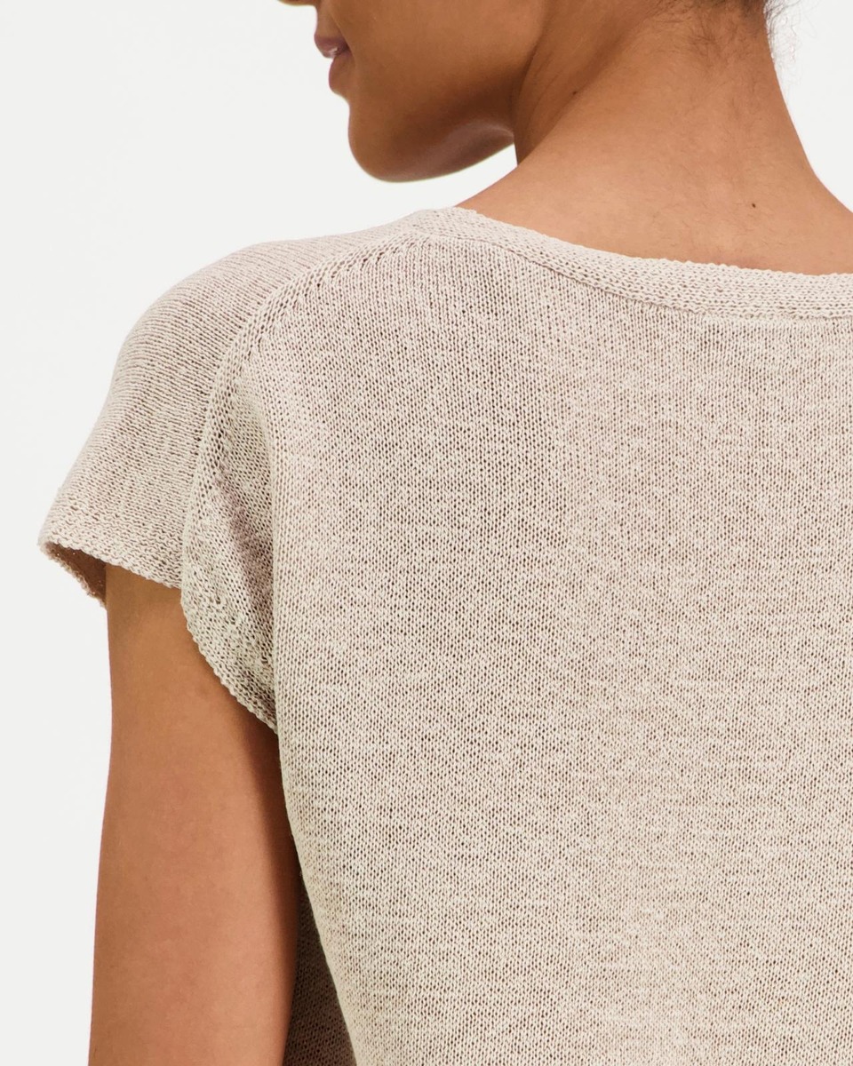 Kevyt, holkkihihainen nauhalankaneule olkapään peittävin holkkihihoin ja V-pääntiellä. Materiaalina on ilmava ja hengittävä pellava-puuvillasekoite, johon polyamidi tuo käyttölujuutta. Takapituus on 56 cm koossa M.