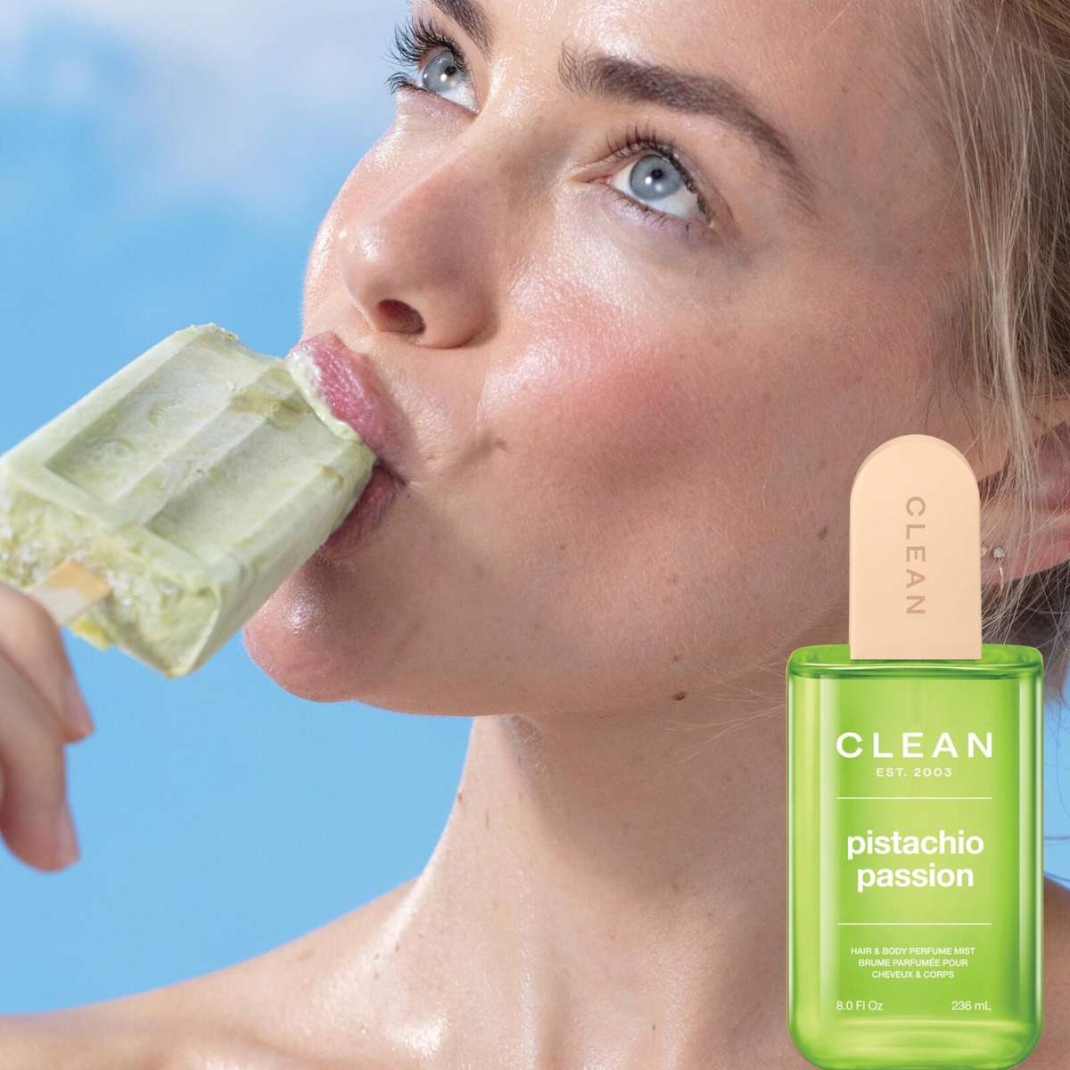 CLEAN Pistachio Passion Hair & Body Perfume Mist tasapainottaa kermaisen ja raikkaan – tuoksu, joka tuntuu pieneltä salaiselta nautinnolta, jota ei tarvitse jakaa kenenkään kanssa. Tuoksu avautuu pehmeällä pistaasilla, lämpimällä rommilla ja raikkaalla bergamotilla. Samettisen pehmeässä ja täyteläisessä sydämessä kohtaavat kurjenmiekka, setripuu ja jasmiini. Pohjatuoksu koostuu meripihkasta, tonkapavusta ja valkohankajäkälästä luoden pehmeän, gourmand-henkisen tunnelman, joka on yhtä koukuttava kuin lempijälkiruokasi. Lisää kermaisuutta ja makeutta saat yhdistämällä sen Whipped Vanilla -tuoksuun.