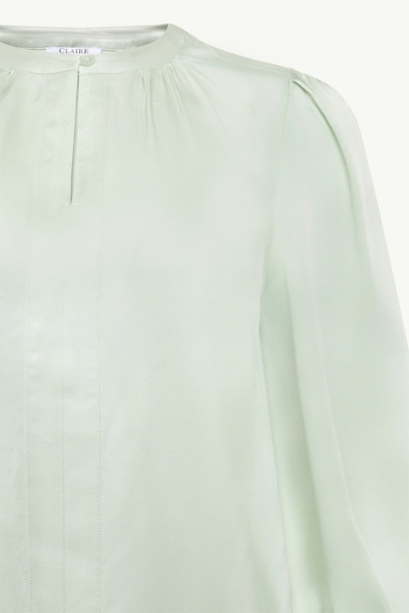 Pusero upeasta satiiniviskoosista. Siro pääntie, joka avautuu kauniisti keskeltä. Hihansuilla joustavat smockrypytykset, joilla säädät hihan oikean mittaisiksi. 3/4- hiha. Helmalla sivuilla kauniit halkiot.