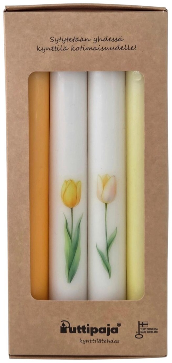 Puttipaja Kruunukynttilä Tulppaani keltainen 22 cm on upea valinta juhliin ja kodin sisustukseen. Nämä kauniit kynttilät luovat lämpimän tunnelman ja tuovat väriä mihin tahansa tilaan. Kynttilät palavat kauniisti ja tasaisesti, joten voit nauttia niiden valosta pitkään. Pakkaus sisältää neljä kynttilää, jotka sopivat täydellisesti eri tilaisuuksiin, kuten syntymäpäiväjuhliin tai romanttisiin illallisiin.