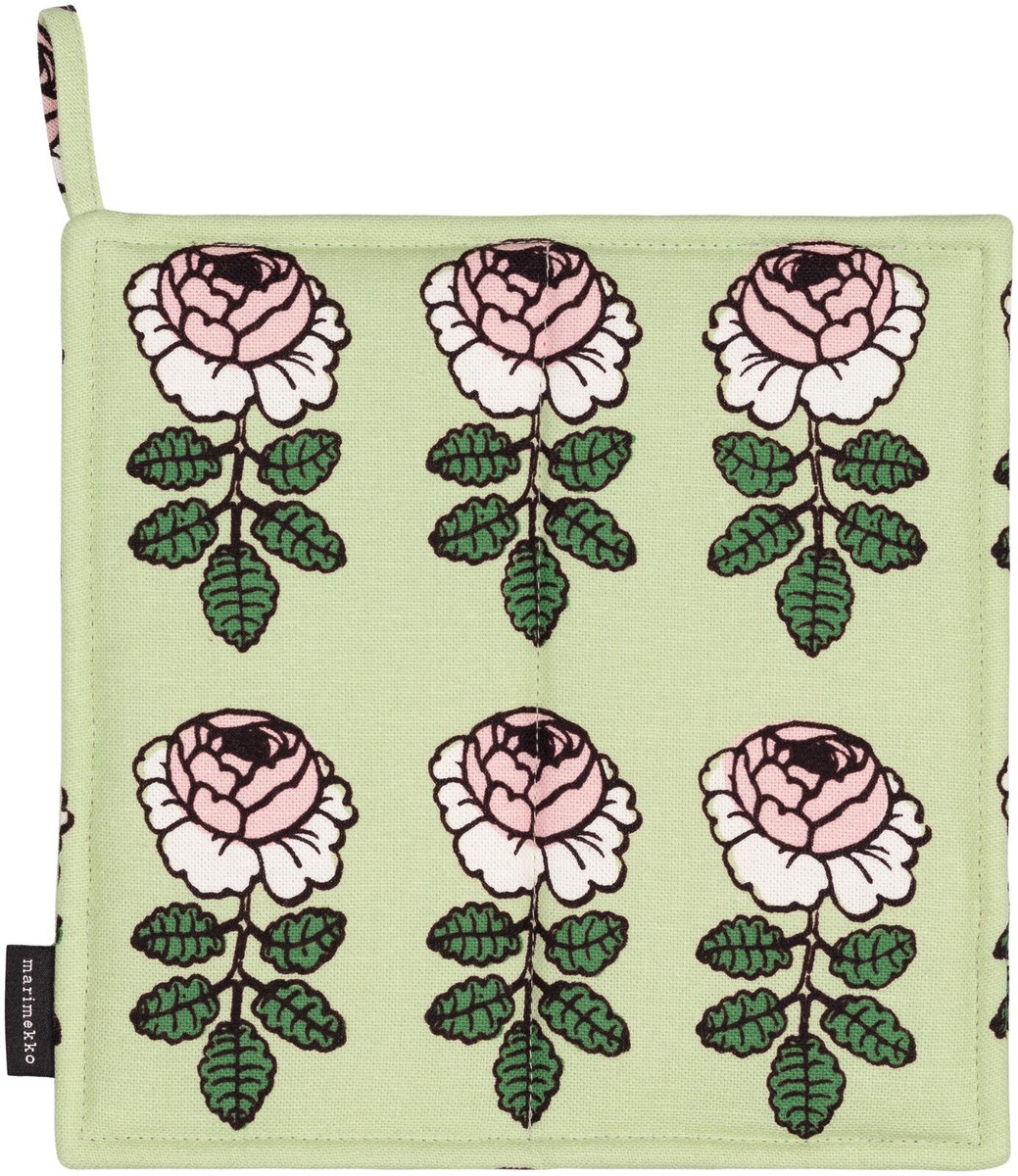 Vihkiruusu-kuosinen pannulappu on painettu Helsingissä, ja siinä on toppaus sekä lenkki ripustamista varten.