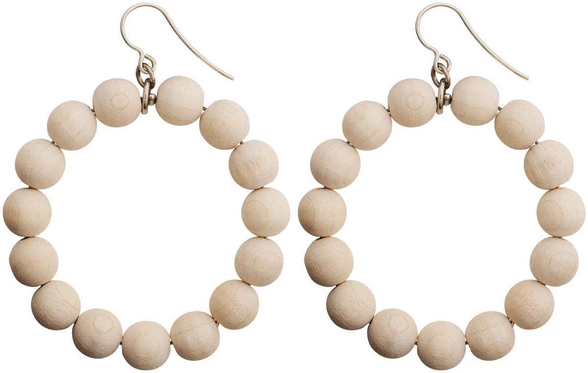Säde-korvakoruissa pienet puuhelmet on pujoteltu metallirenkaaseen. Korvakorujen mitat: pituus 6 cm, halkaisija 5 cm. Valmistettu käsityönä Suomessa.