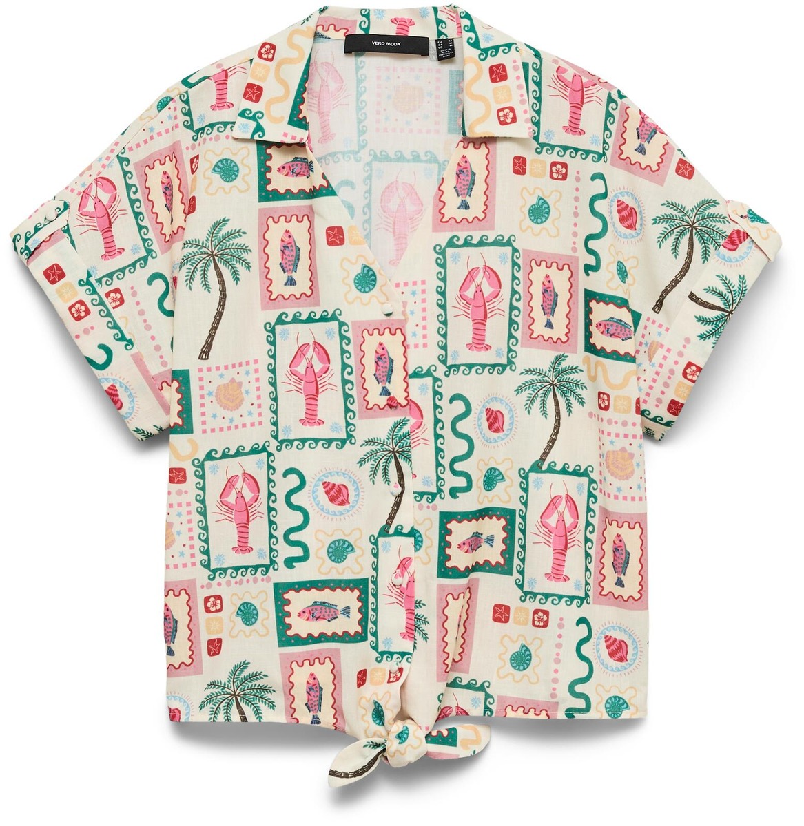 Tuo lomatunnelma arkeen tällä raikkaalla ja värikkäällä puserolla! Puserossa on lyhyet hihat, rentoon tyyliin solmittava helma ja avara kaulus, joka antaa rennon ilmeen. Kuosissa yhdistyvät tropiikin inspiroimat elementit – palmut, postimerkkimäiset kuviot ja leikkisät värit (vaaleapohjainen kangas, pinkin, vihreän ja turkoosin sävyt).