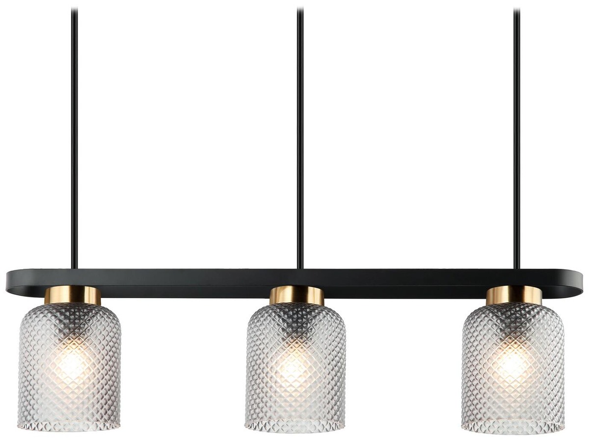 Moderni riippuvalaisin kolmella savunharmaalla lasikuvulla. Kultaiset yksityiskohdat. Helppo asennus kattokoukkuun ja valaisinpistotulpalla.