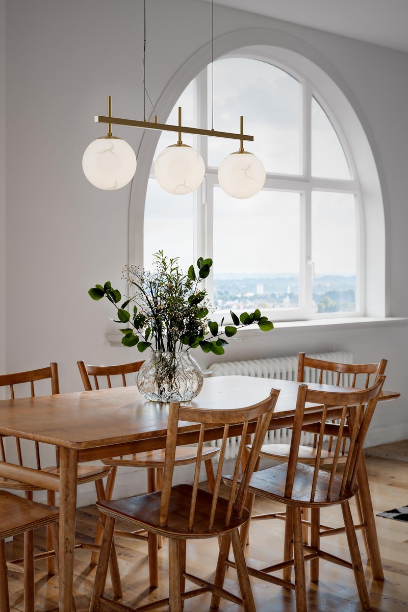 Lineaarinen Bellagio on ruokailutilan katseenvangitsija – kolmen lasikuvun rytmi rakentaa tasapainoisen, art deco -vivahteisen siluetin. Marmoroidut opaalilasit pehmentävät valon kauniiksi tunnelmaliseksi hehkuksi, joka tekee kattauksesta kutsuvan kodikkaan. Sopii myös kapean keittiösaarekkeen valaisimena – lämmin messinki ja pehmeä lasi tuovat tilaan rauhallisen, viimeistellyn tunnelman.