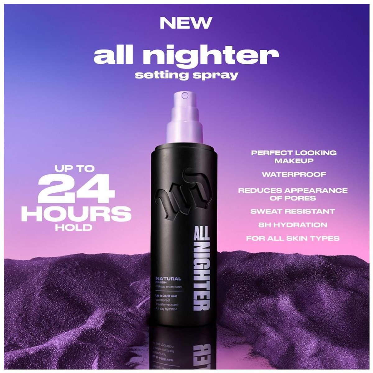 Tapaa täysin uusi All Nighter – viimeistelysuihke. Uusi koostumus ja upeampi pakkaus! Pysyy iholla jopa 24 tuntia, luonnollinen lopputulos. Ole voittamaton. Sano hyvästit meikkikatastrofeille! Muutama suihkaus riittää pitämään meikkisi täydellisenä ja vastalevityn näköisenä – koko päivän ja yön, ihotyypistä riippumatta. Me asetimme standardin viimeistelysuihkeille, ja nyt nostamme rimaa entisestään. Kevyt suihkeemme levittyy tasaisesti, viilentää ihoa 4 ºC** välittömästi ja pitää ihon kosteutettuna 8 tunnin ajan. HYÖDYT 1. PYSYY IHOLLA JOPA 24 TUNTIA* 2. MEIKKI NÄYTTÄÄ TÄYDELLISELTÄ 3. VEDENKESTÄVÄ 4. TEKEE IHOHUOKOSISTA VÄHEMMÄN NÄKYVIÄ 5. 8 TUNNIN KOSTEUTUS 6. HIENKESTÄVÄ 7. EI TAHRAA 8. KIINNITTÄÄ MEIKKISI 9. IHO TUNTUU RAUHOITTUNEELTA 10. SOPII KAIKILLE IHOTYYPEILLE 11. ESTÄÄ MEIKKIÄ HAKKEILEMASTA 12. EI TAHMAA 13. EI JÄTÄ JÄLKIÄ 14. EI LEVIÄ 15. HÖYHENENKEVYT 16. VIILENTÄÄ IHOA VÄLITTÖMÄSTI 4 ºC** 17. VOITTAMATON LUONNOLLINEN LOPPUTULOS 18. SISÄLTÄÄ GLYSERIINIÄ 19. USKOMATTOMAN MIELLYTTÄVÄ 20. MIKROHIENO SUIHKE 21. TEKEE IHON PINNASTA TASAISEMMAN 22. EI TEE MEIKISTÄ "KAKKUMAISTA" 23. ESTÄÄ MEIKKIÄ HAALISTUMASTA 24. ANTAA IHON HENGITTÄÄ *itsearviointi, N=102 **instrumentaalinen testi