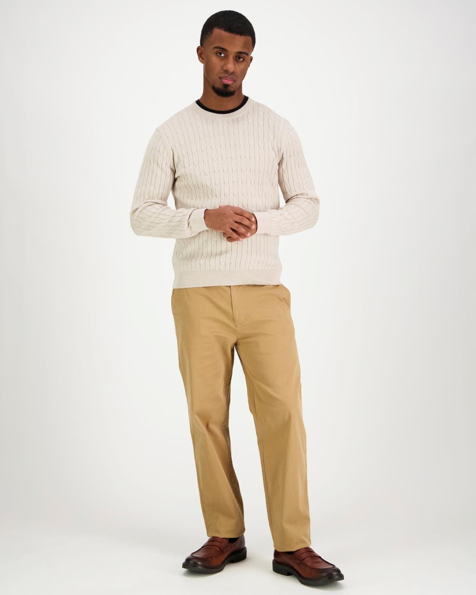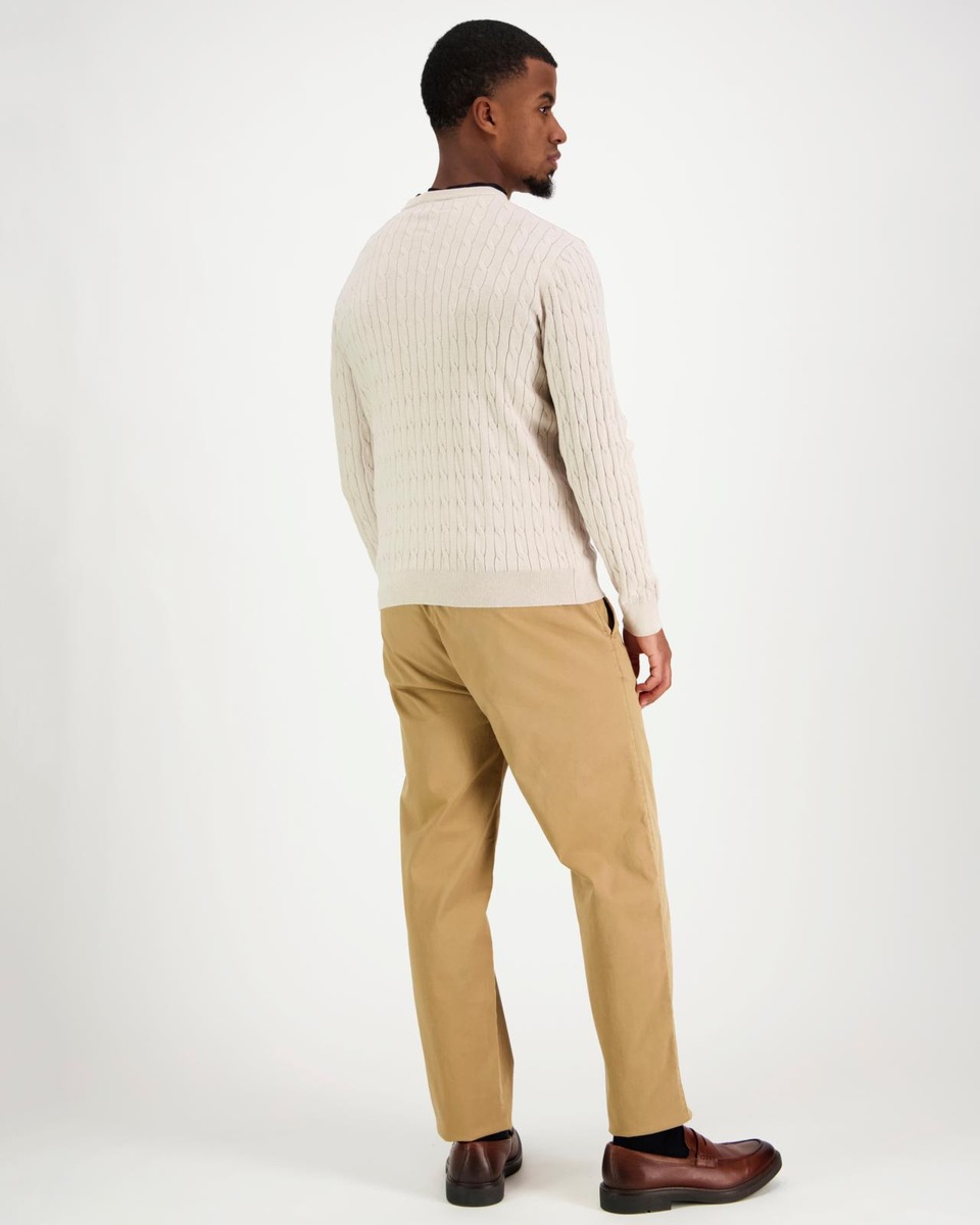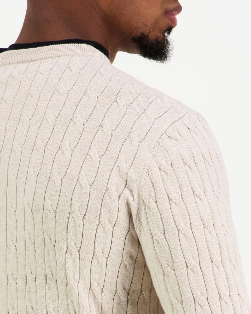 Puuvilla-kshmirista valmistettu palmikkoneule. Pääntiellä, helmassa ja hihansuissa on resorineulosta.