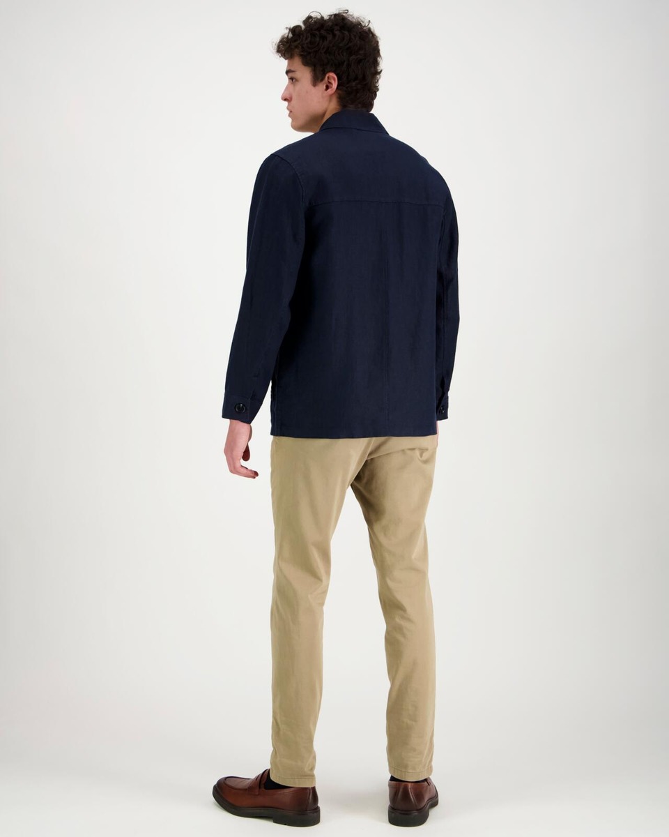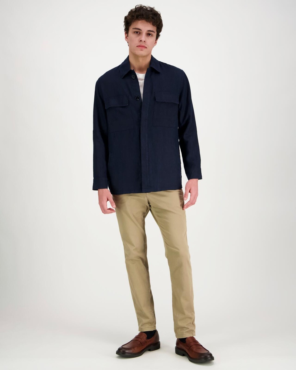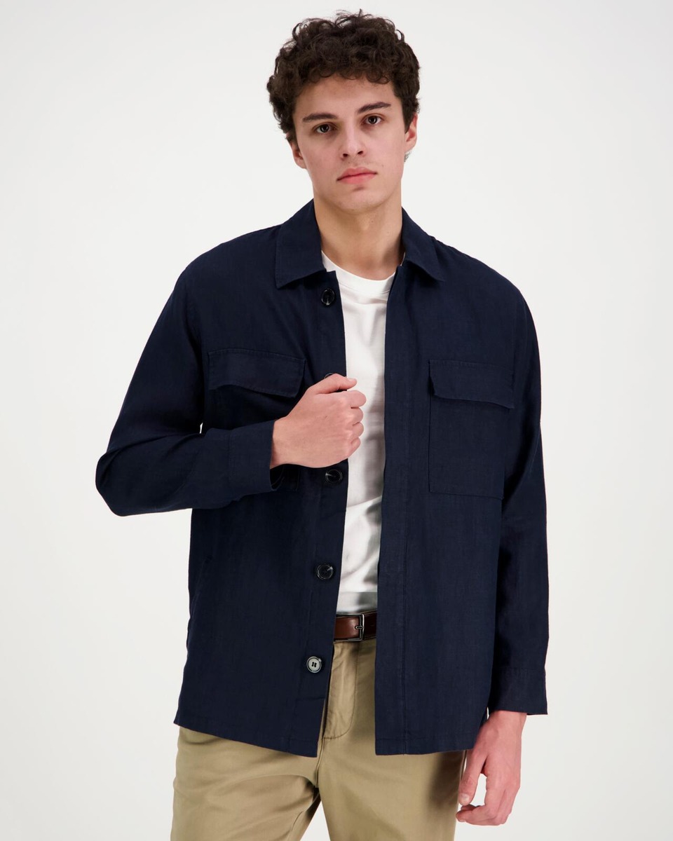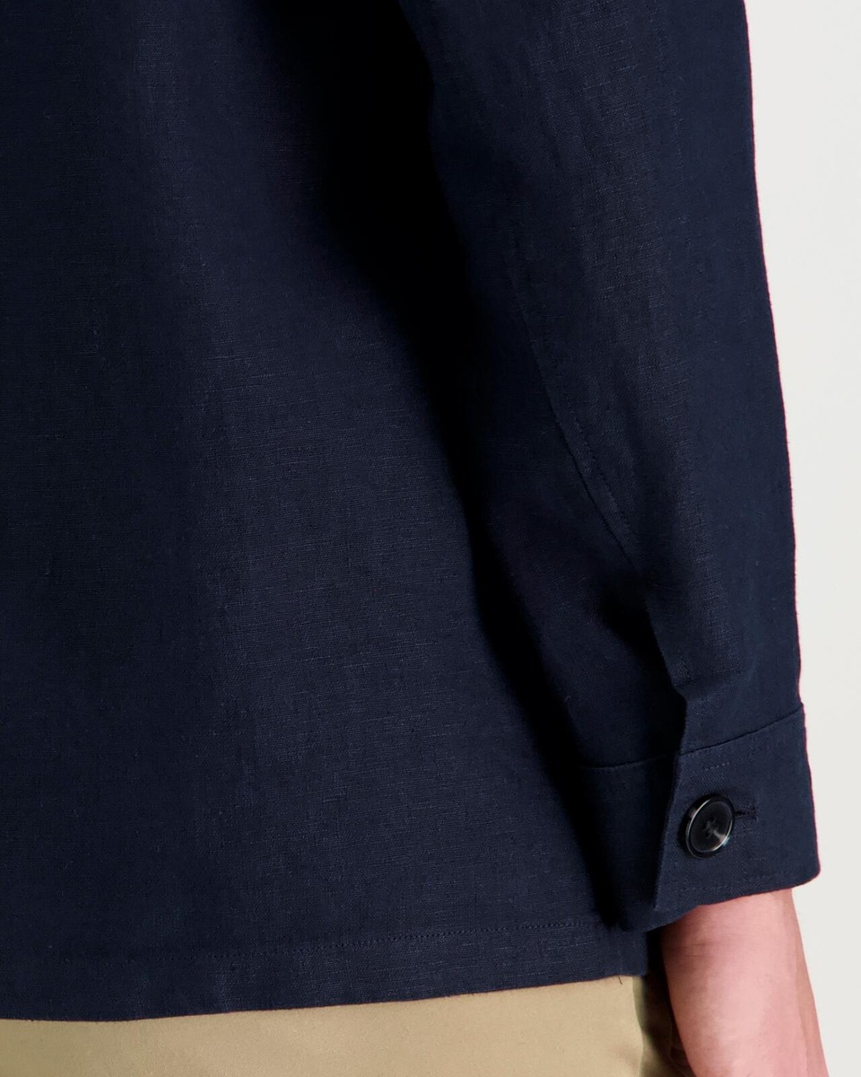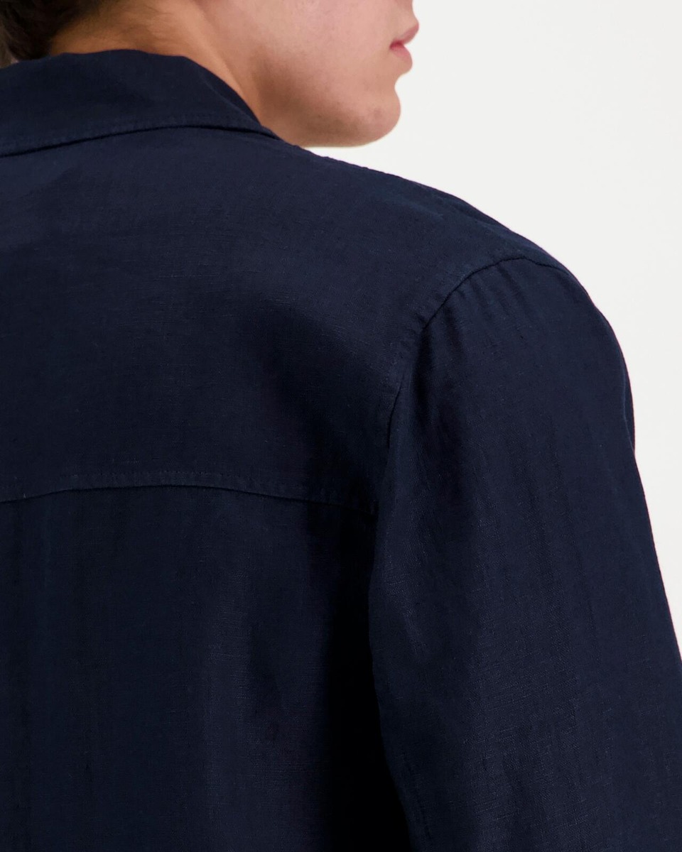 Pellavainen paitatakki, jossa edessä piilonapitus. Rinnassa läpälliset paikkataskut. Sivuilla upotetut taskut.