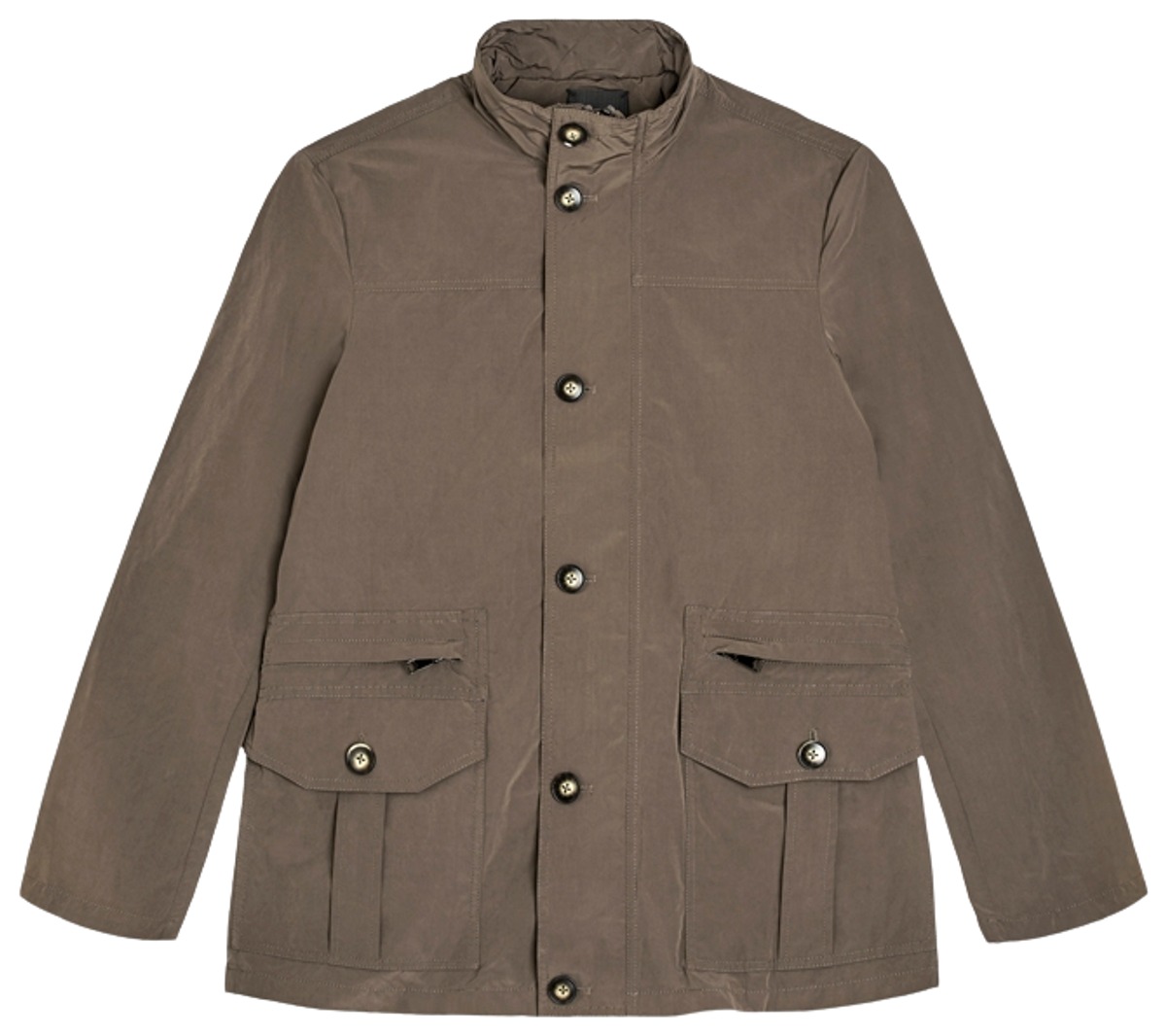 Vetoketjullinen takki, jossa edessä vetoketjusuljenta ja nappi ylhäällä. Korkea kaulus. Vetoketjutaskut edessä sekä kaksi läppätaskua. Säädettävä nyöri takana vyötäröllä. Moderni istuvuus