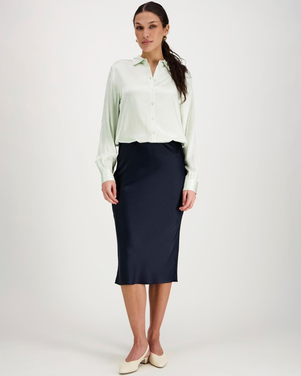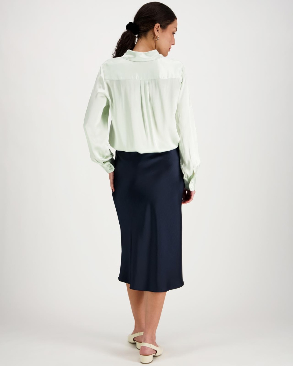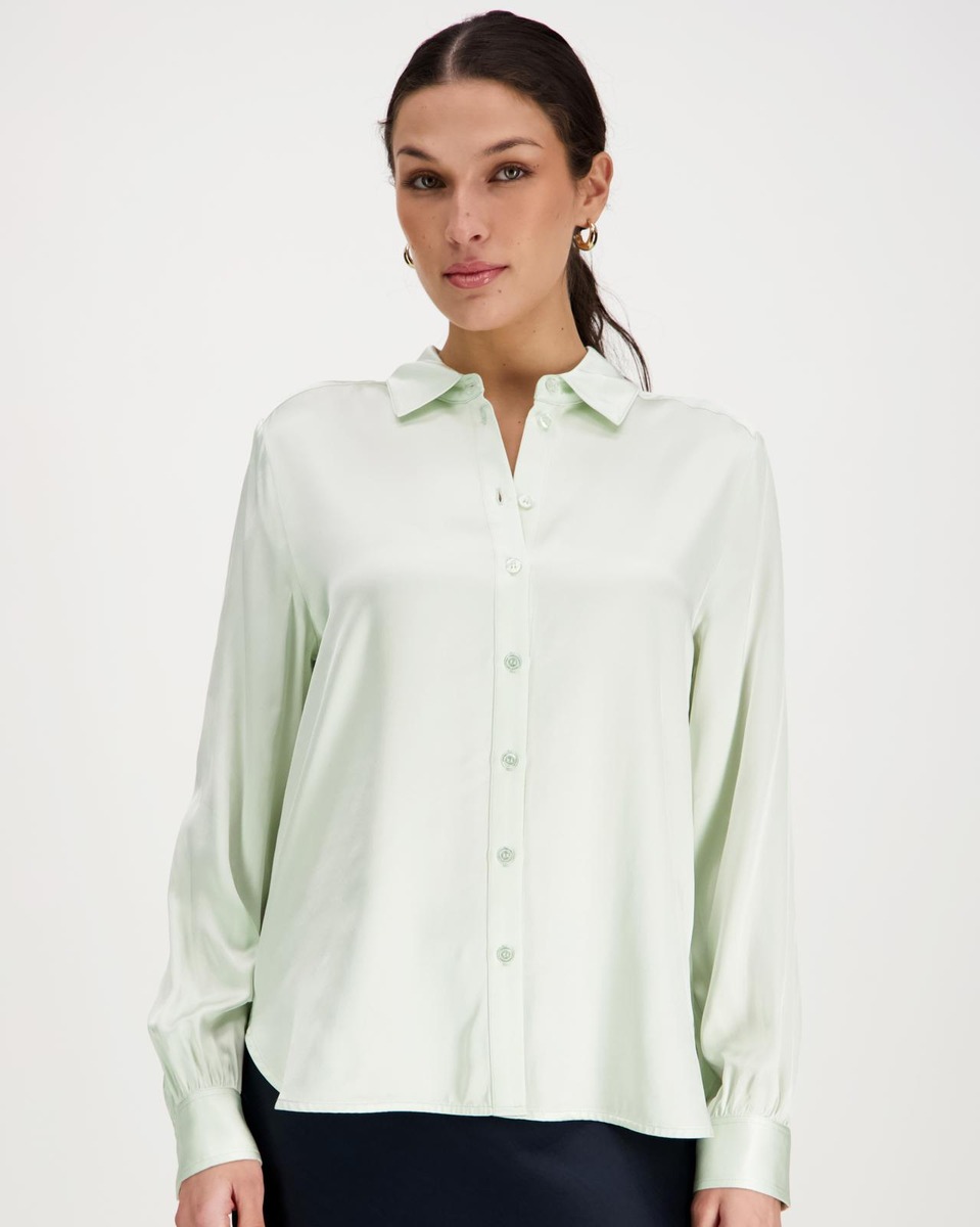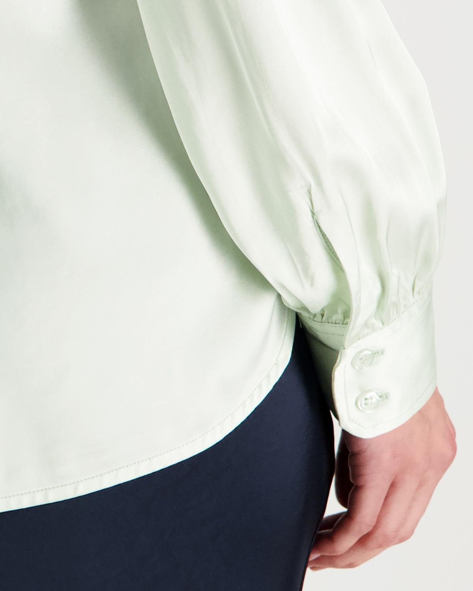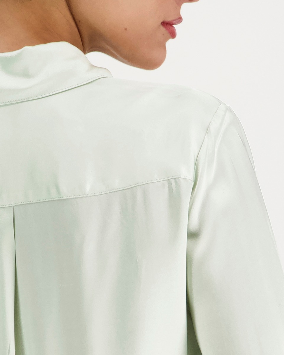 Pusero kauniisti laskeutuvasta satiiniviskoosista. Edessä napit , pyöristetty helma sekä mansetit hihansuilla.