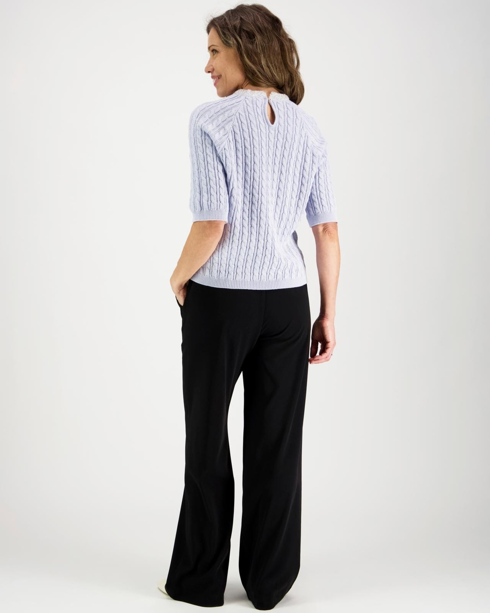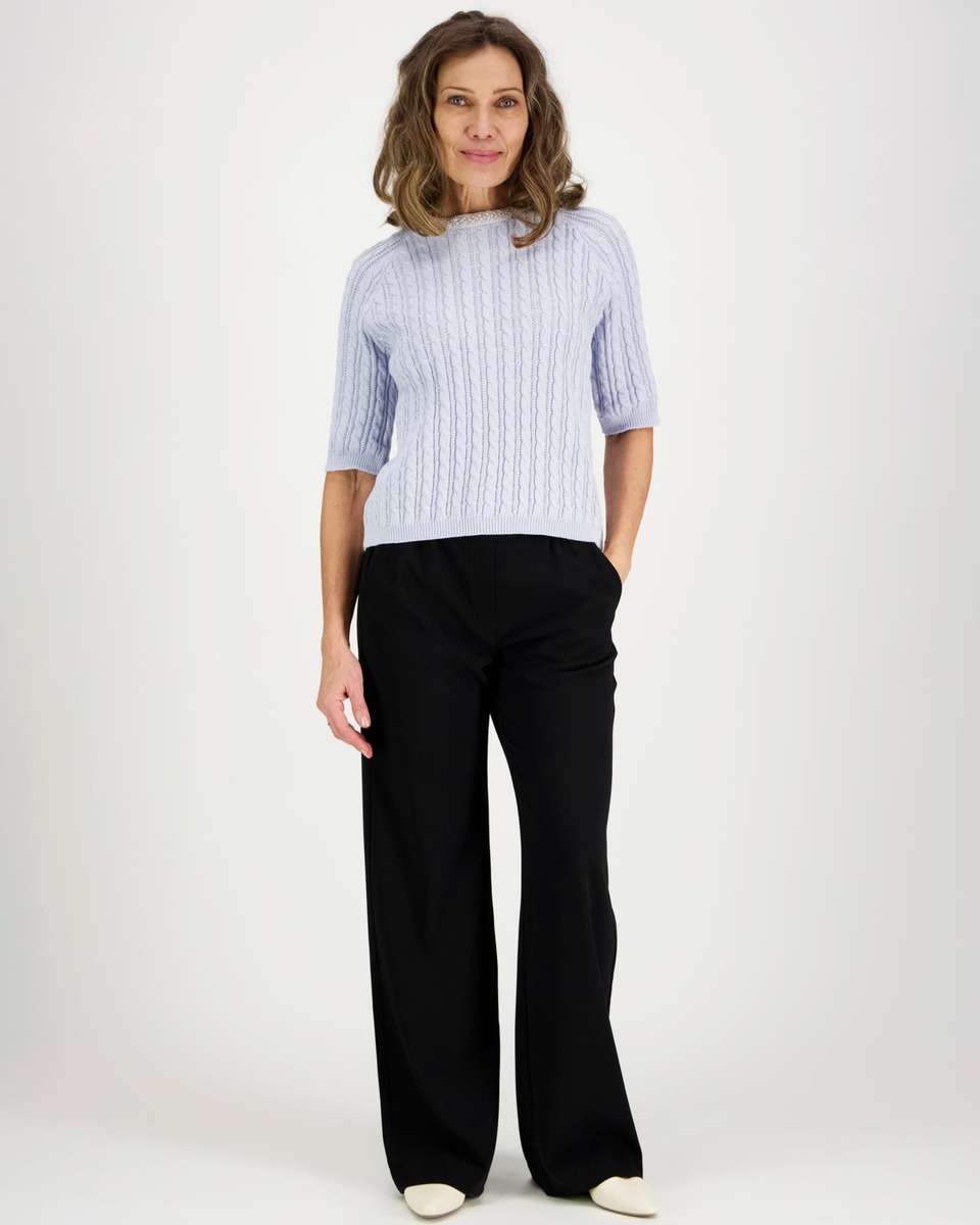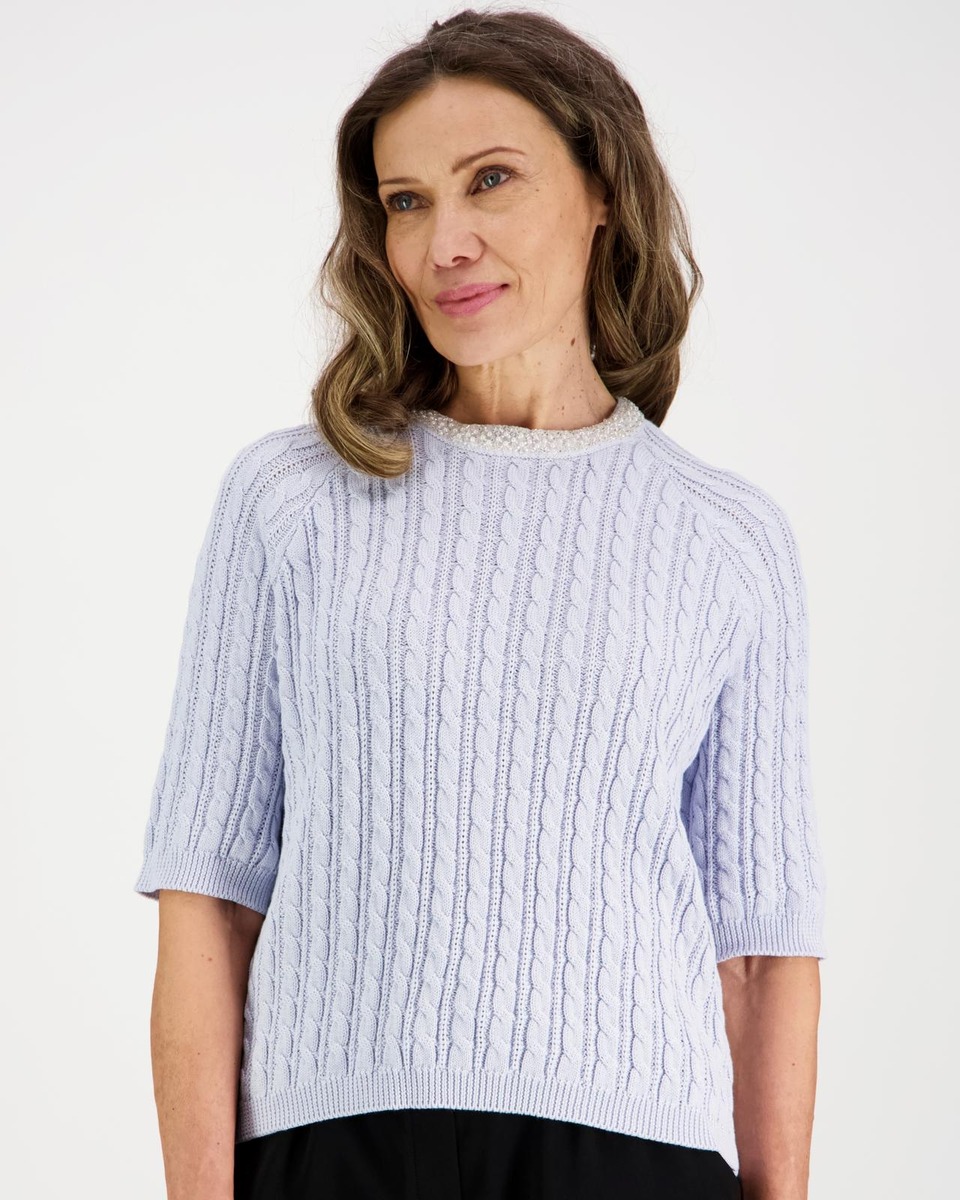 3/4 hihainen palmikko neuloksinen juhlava pusero orgaanisesta puuvillasta. O-pääntiellä on kaunis helmipanta. . Takana pääntiellä helminappikiinnitys. Hihansuilla ja helmalla resorit.