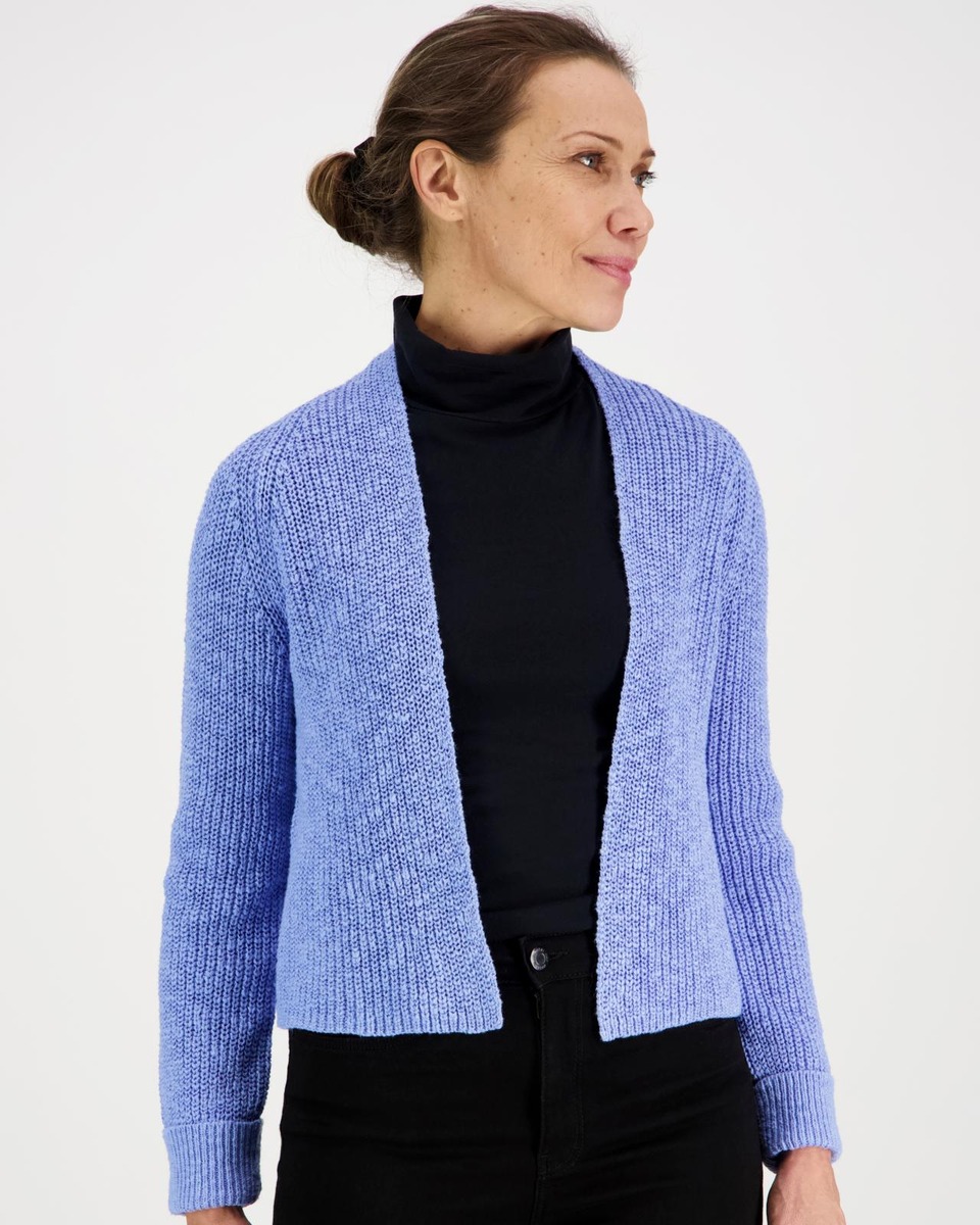 Siro, lyhyt neulejakku rib neuloksella . Neulejakussa on suora helma. Hihansuilla käänteet.