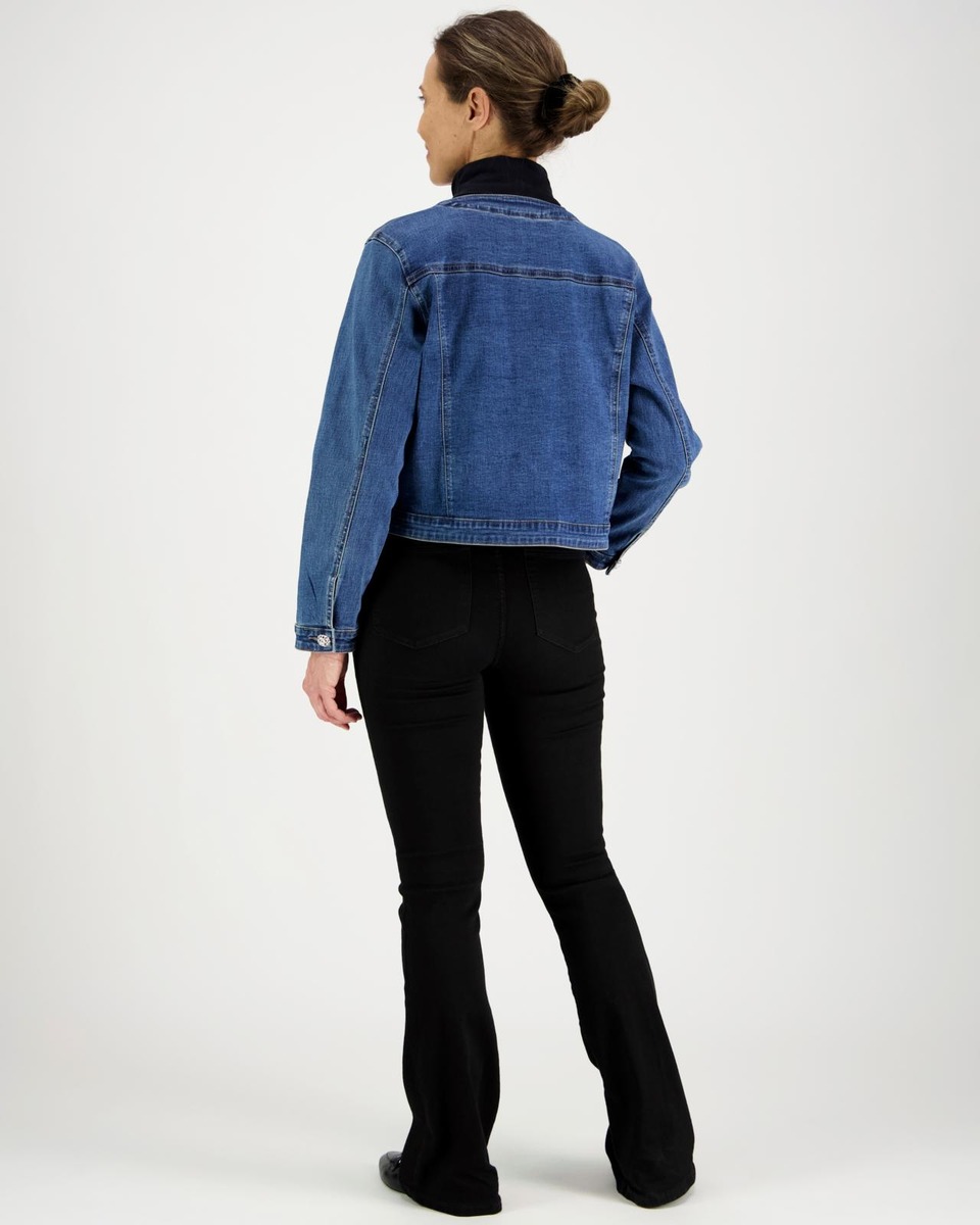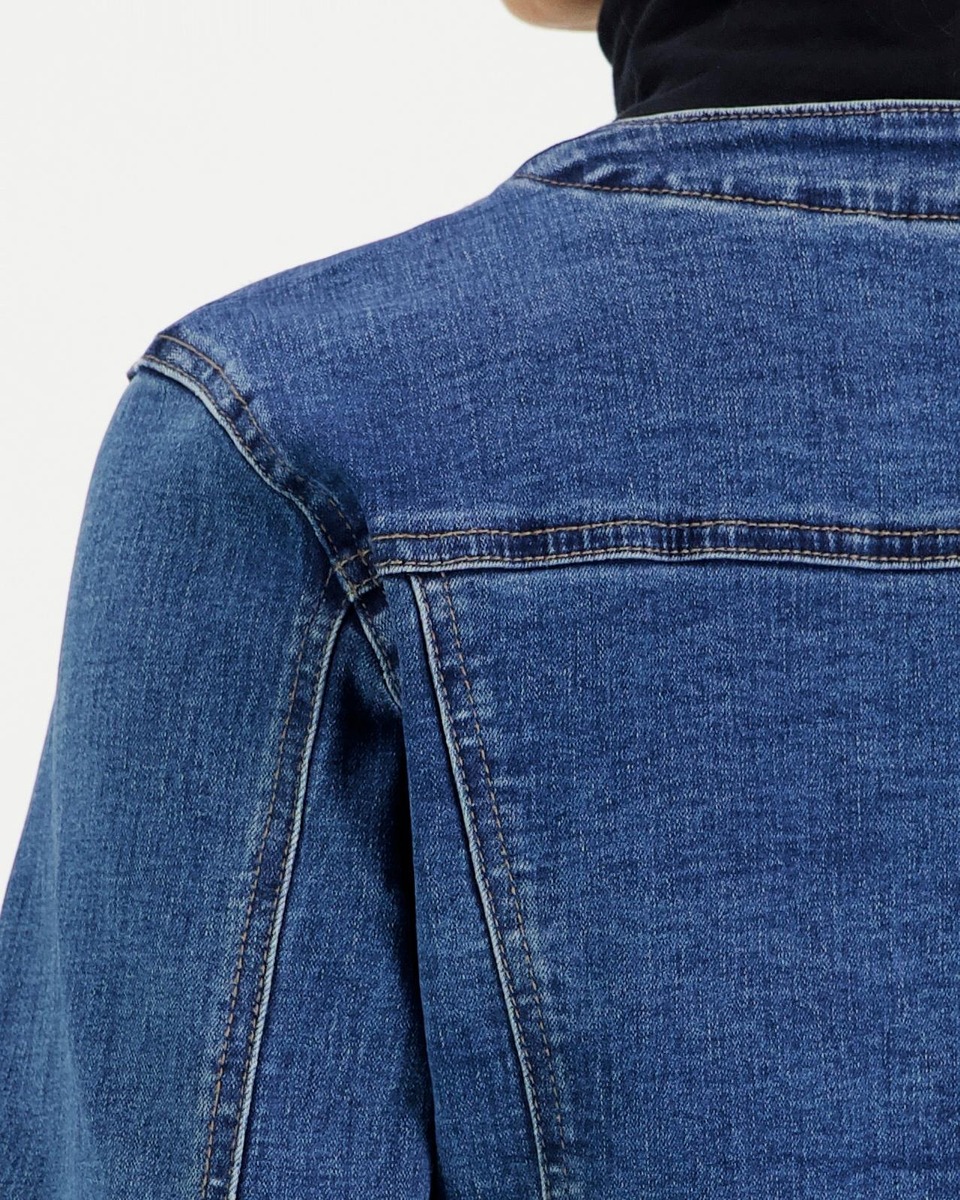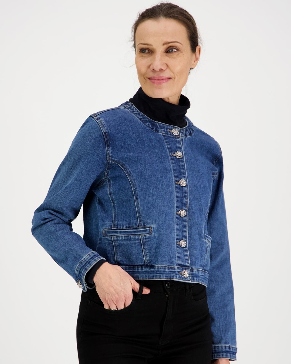Denimjakku pyöreällä pääntiellä ja sirolla leikkauksella. Materiaalina pehmeä ja keveästi joustava denim. Edessä alahalla listataskut.Takissa on kauniina yksityiskohtana sirot koristenapit.