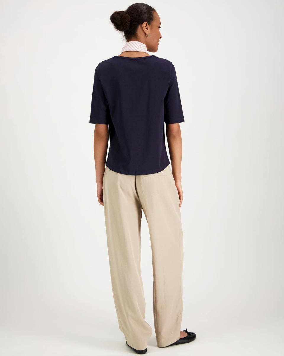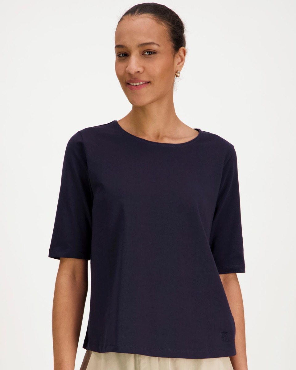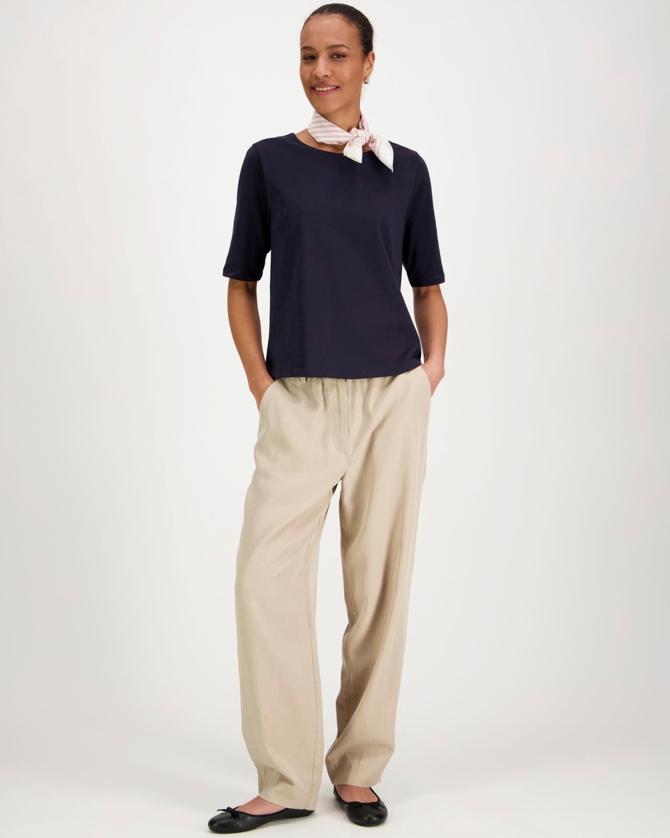 3/4-hihainen trikoopusero , jossa materiaalina pehmeä GOTS-sertifioitu puuvilla keveällä joustolla. Kaunis venepääntie